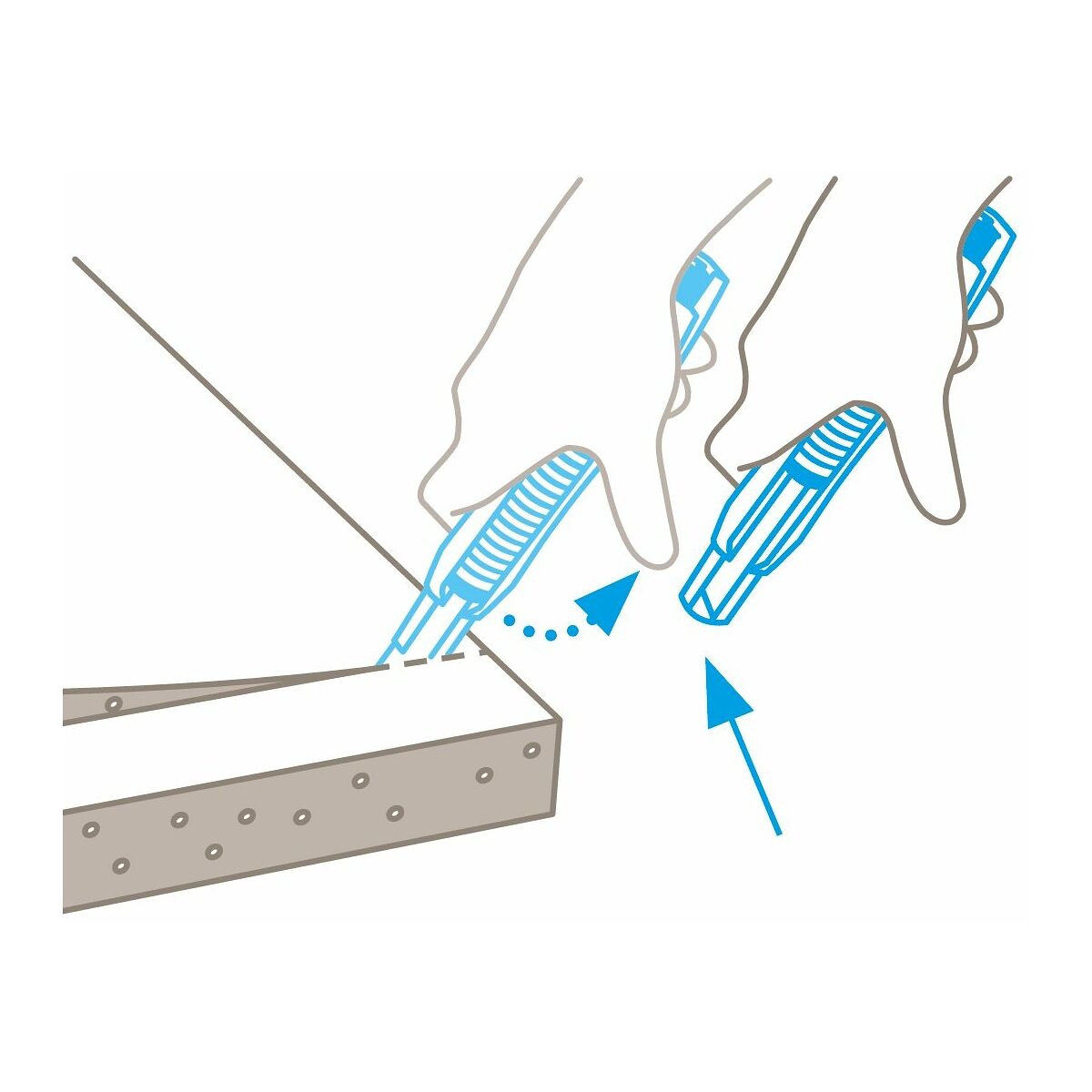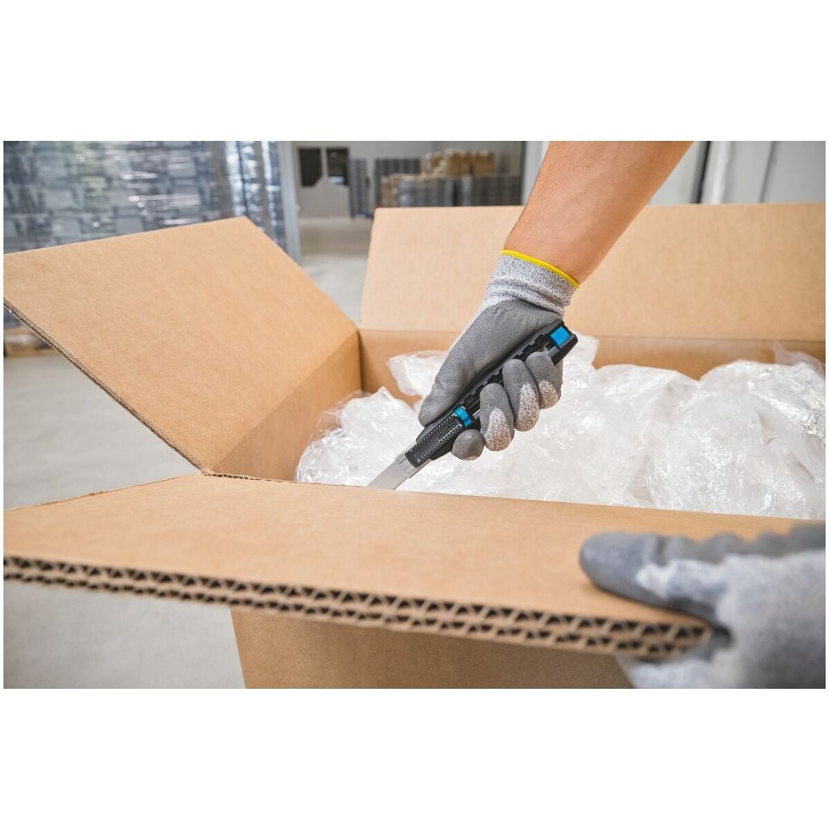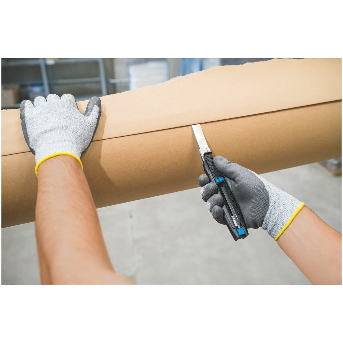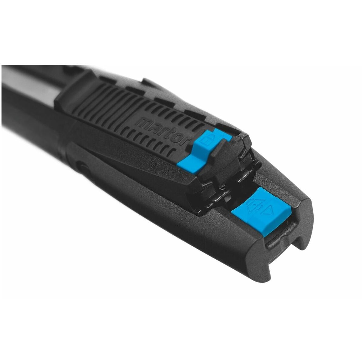 Säkerhetskniv med 7 – 73 mm skärdjup (inställbart i 7 steg) och som tillval med automatisk indragning av klingan. Ergonomiskt handtag av glasfiberarmerad plast med en robust metallskena på insidan som styr klingan. Säkert och enkelt klingbyte.