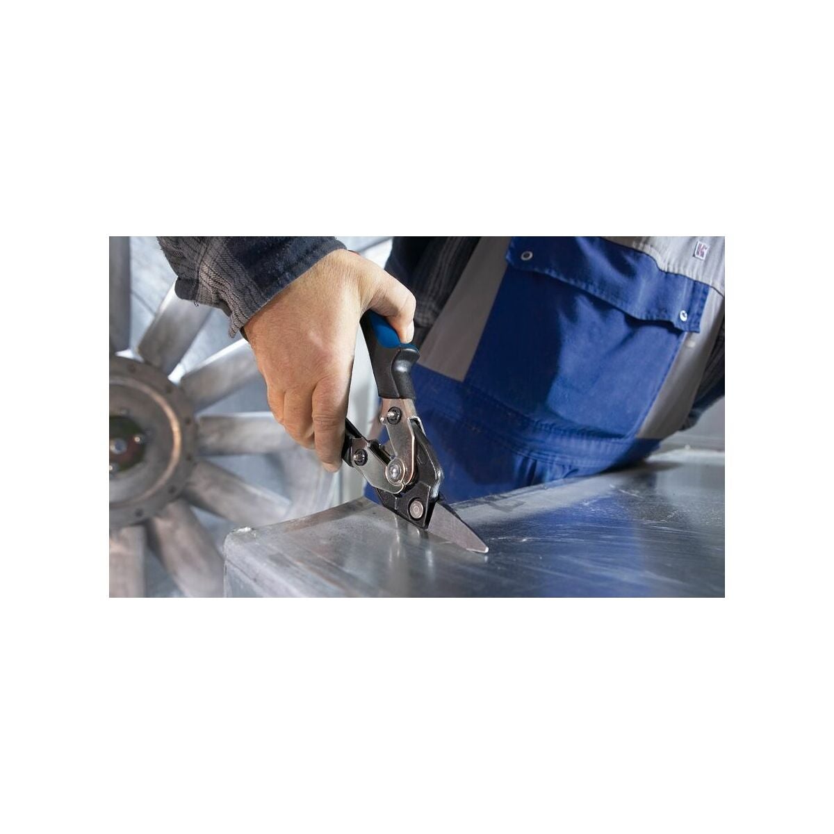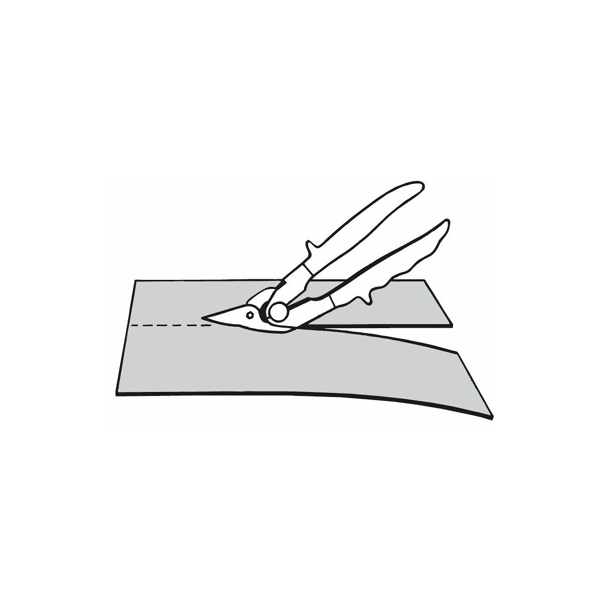 Som fasonplåtsaxar. Skär av rostfritt stål (HRC 60), skänklar av förnicklad stålplåt. Tvåkomponentshandtag med greppsäkra mjuka inlägg som skonar handen.