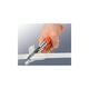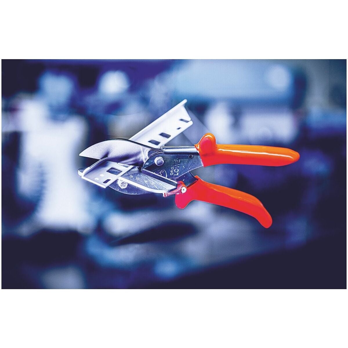 Saxkropp av stålplåt, skär av högvärdigt specialstål (PTFE-beläggning mot vidhäftning), mothåll av lättmetall med två anslag vid 45° och markeringar för 15°, 60° och 90°. Plastklätt handtag och halkskydd, högglansförkromad sax.
