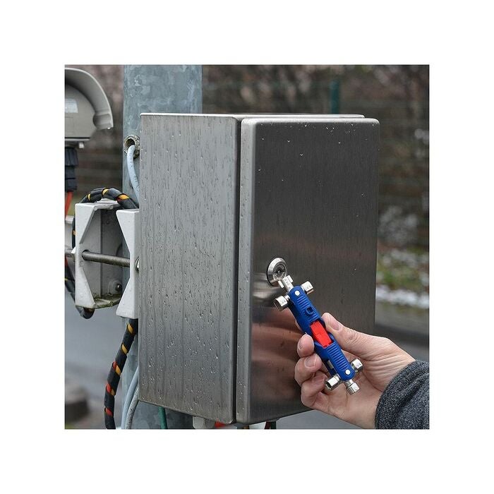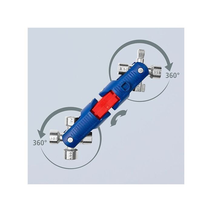 Lätthanterlig universalnyckel med svänginsatser av zinkpressgods. Svängarmar och kopplingar av plast. Sammanlagt kan åtta olika sluthuvuden (för totalt 10 olika låsningar) placeras. Kan användas både som T-handtag och som kompakt sammanstucken variant. 1/4 tum hylsnyckelfäste möjliggör bekväm påskjutning och fasthållning av 1/4 tum hylsnyckelinsatser.