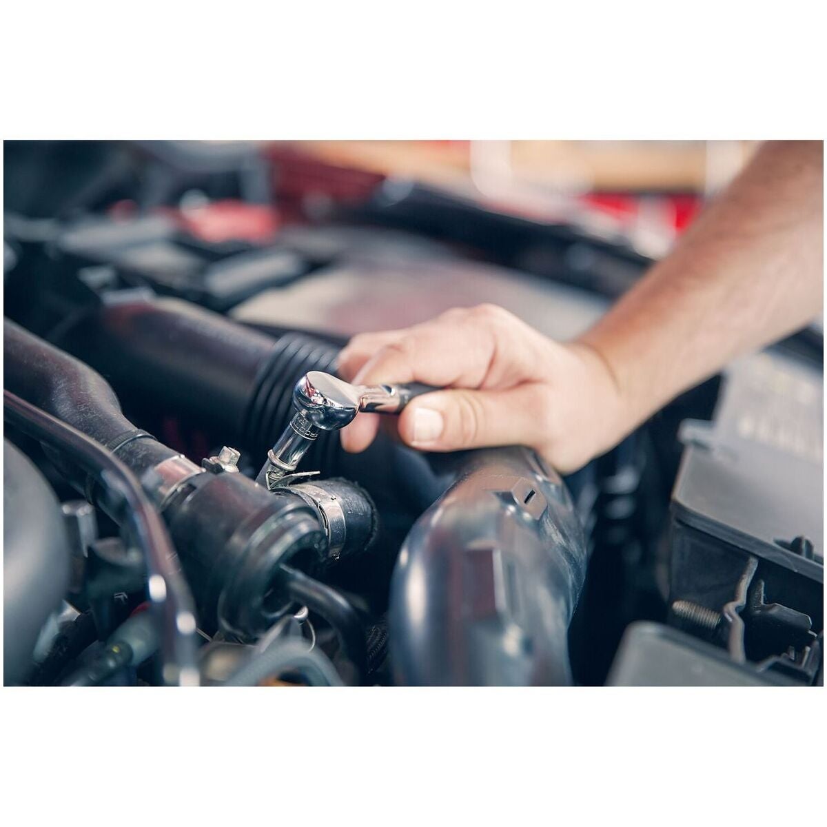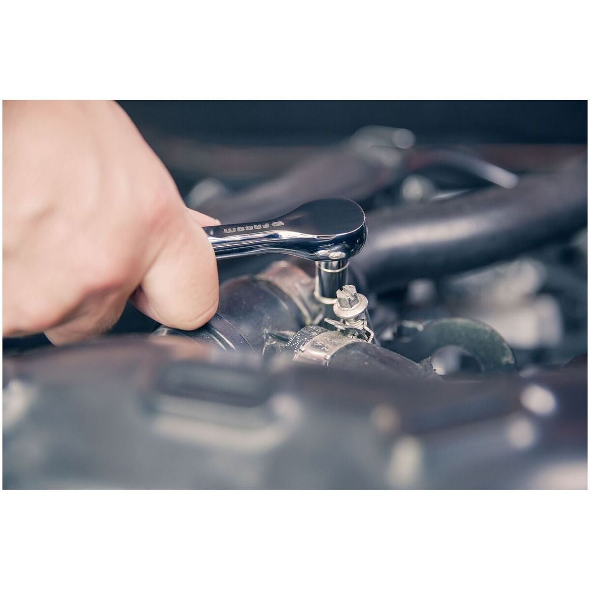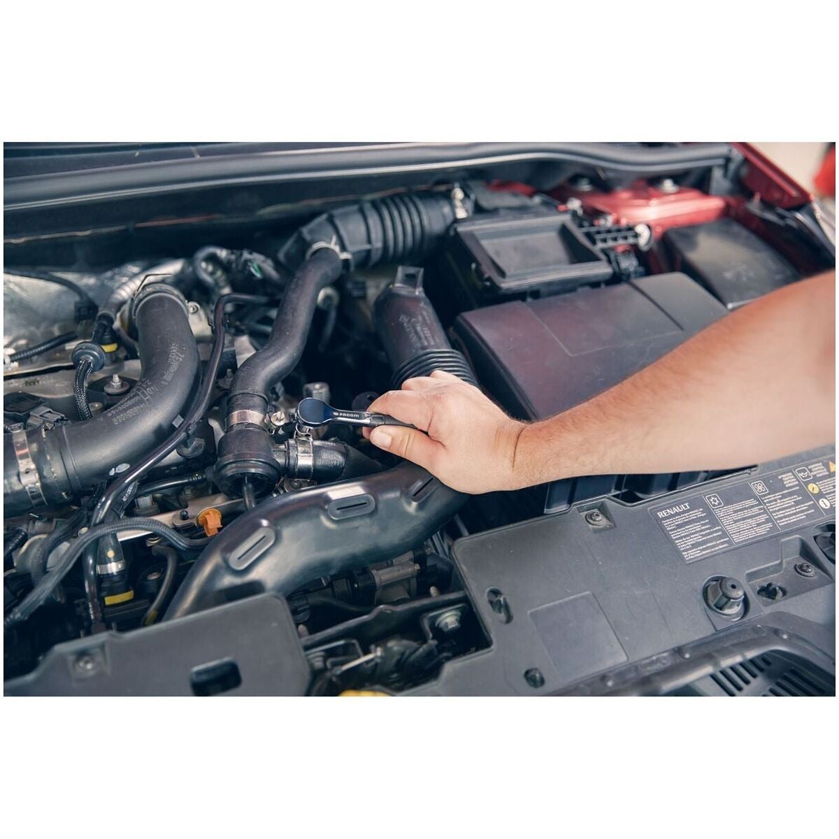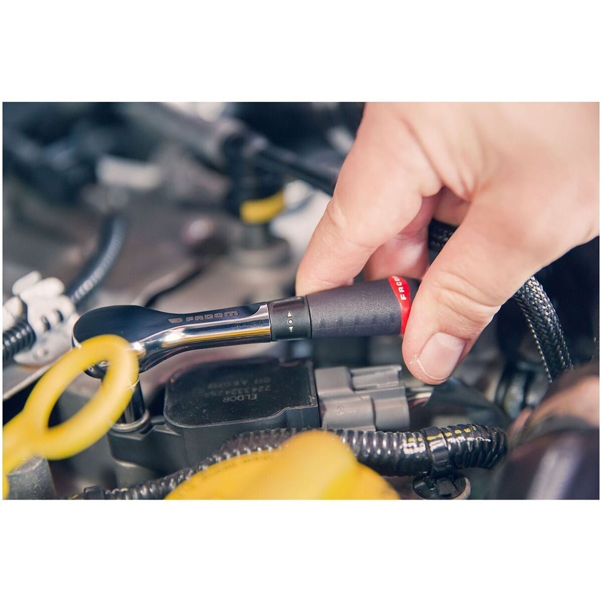 Robust spärrnyckel i kort, slank form. Särskilt lämpad för trånga utrymmen. Med ergonomiskt fingerstöd i handtagets ände. Vinklade 15°.