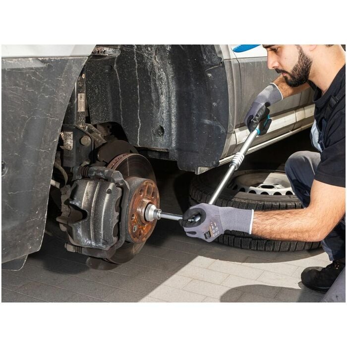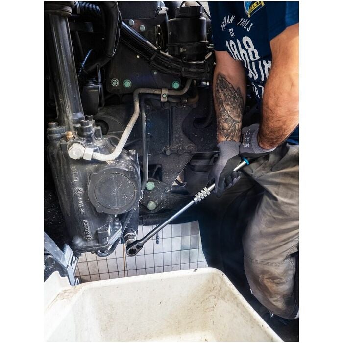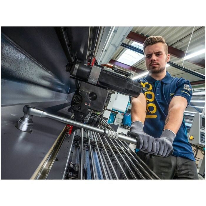 Steglöst utdragbar från 414 till 614 mm längd. Omkopplingsbar fintandspärrnyckel med 90 tänder. Största tillåtna vridmoment 1000 Nm.