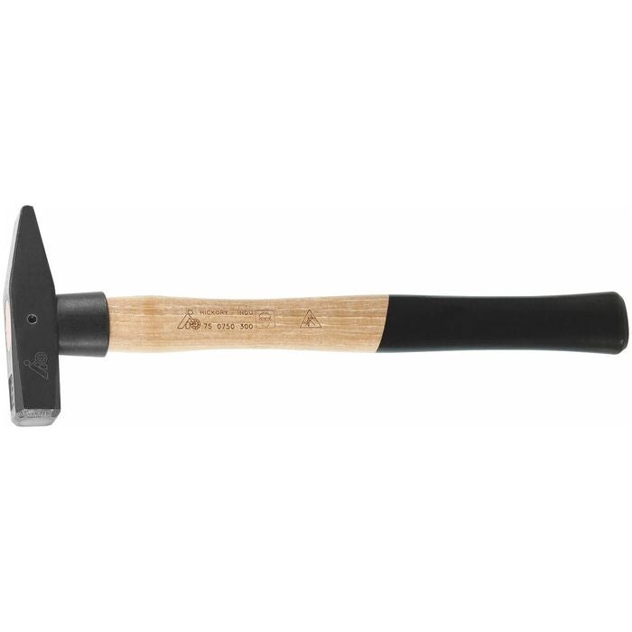 Säkerhetsåtgärder: Kantzoner på styrstången och banan är induktivt härdade mot flisning, nylonskyddshylsa för skaftet och bultsäkring av huvudet. Med hickoryskaft rundad form, lackerad.