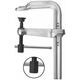 Skena och fast back av draget blankt stål (specialprofil), seghärdade och elförzinkade. Rörlig back av stål, sänksmidd, seghärdad och elförzinkad. Slitstark och lättgående stålspindel med metrisk gänga. Lång livslängd tack vare värmebeständig specialtryckplatta med inlägg av sintrat stål, vridbar upp till 35°. Seghärdad och brunerad spindel med skjutbart T-handtag.