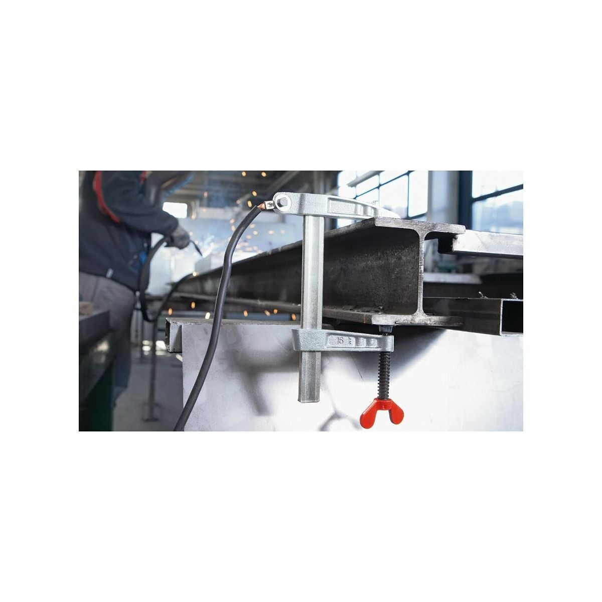Högvärdiga spännarmar av aducerat gjutgods med anslutningsögla för elsvetskabel på övre spännarmen. Kraftig spindel med rörlig, kulledad tryckbricka. Högglansförzinkad skruvtving.