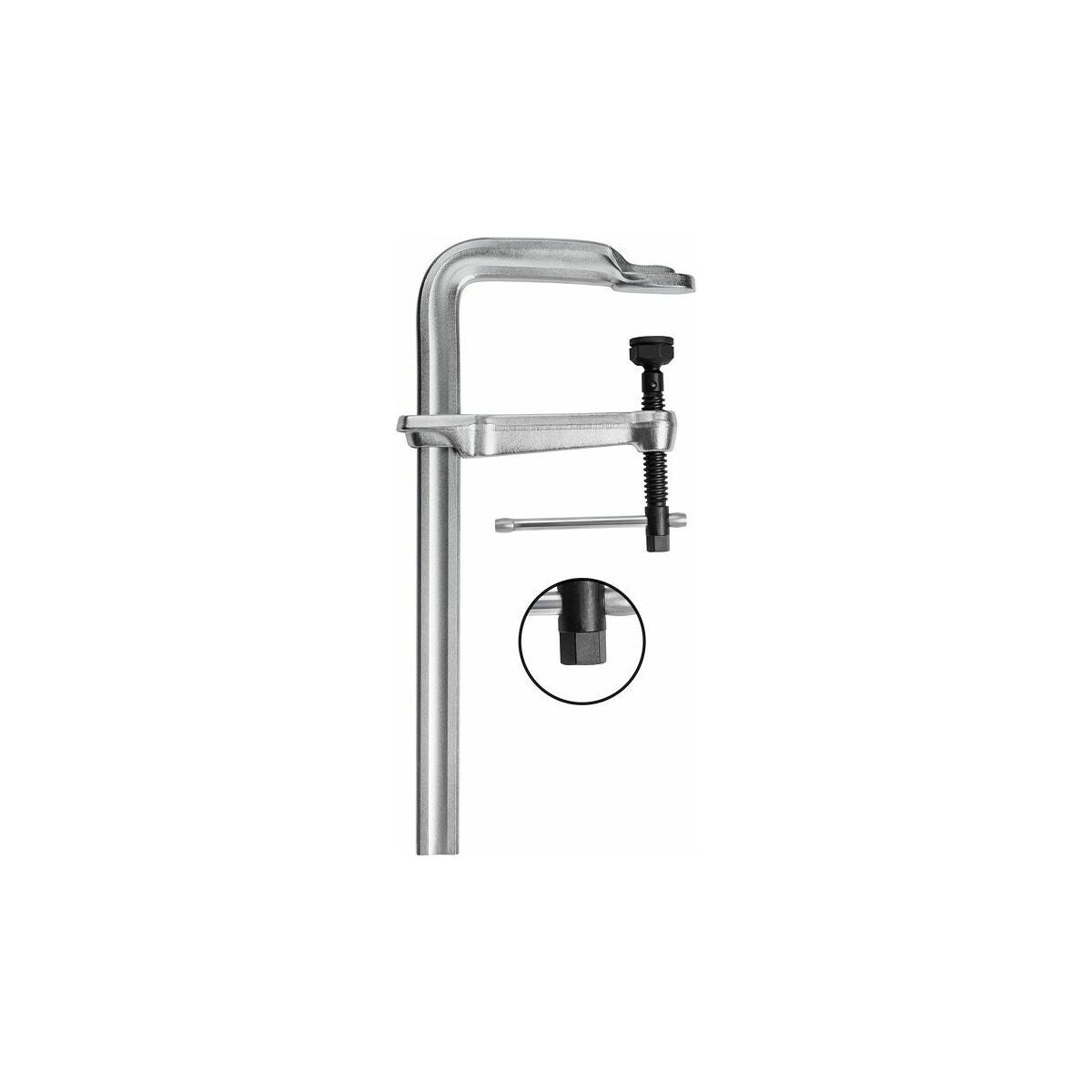 Skena och fast back av draget blankt stål (specialprofil), seghärdade och elförzinkade. Rörlig back av stål, sänksmidd, seghärdad och elförzinkad. Slitstark och lättgående stålspindel med trapetsgänga. Lång livslängd tack vare värmebeständig specialtryckplatta med inlägg av sintrat stål. Seghärdad och brunerad spindel med skjutbart T-handtag.