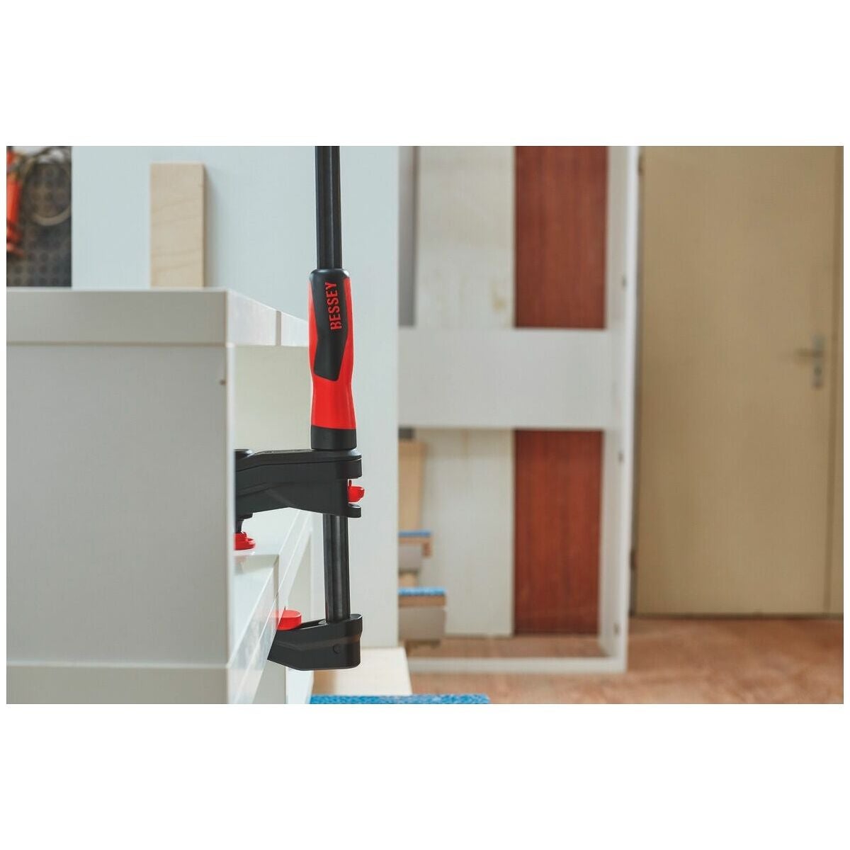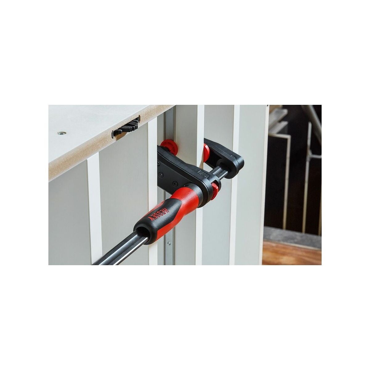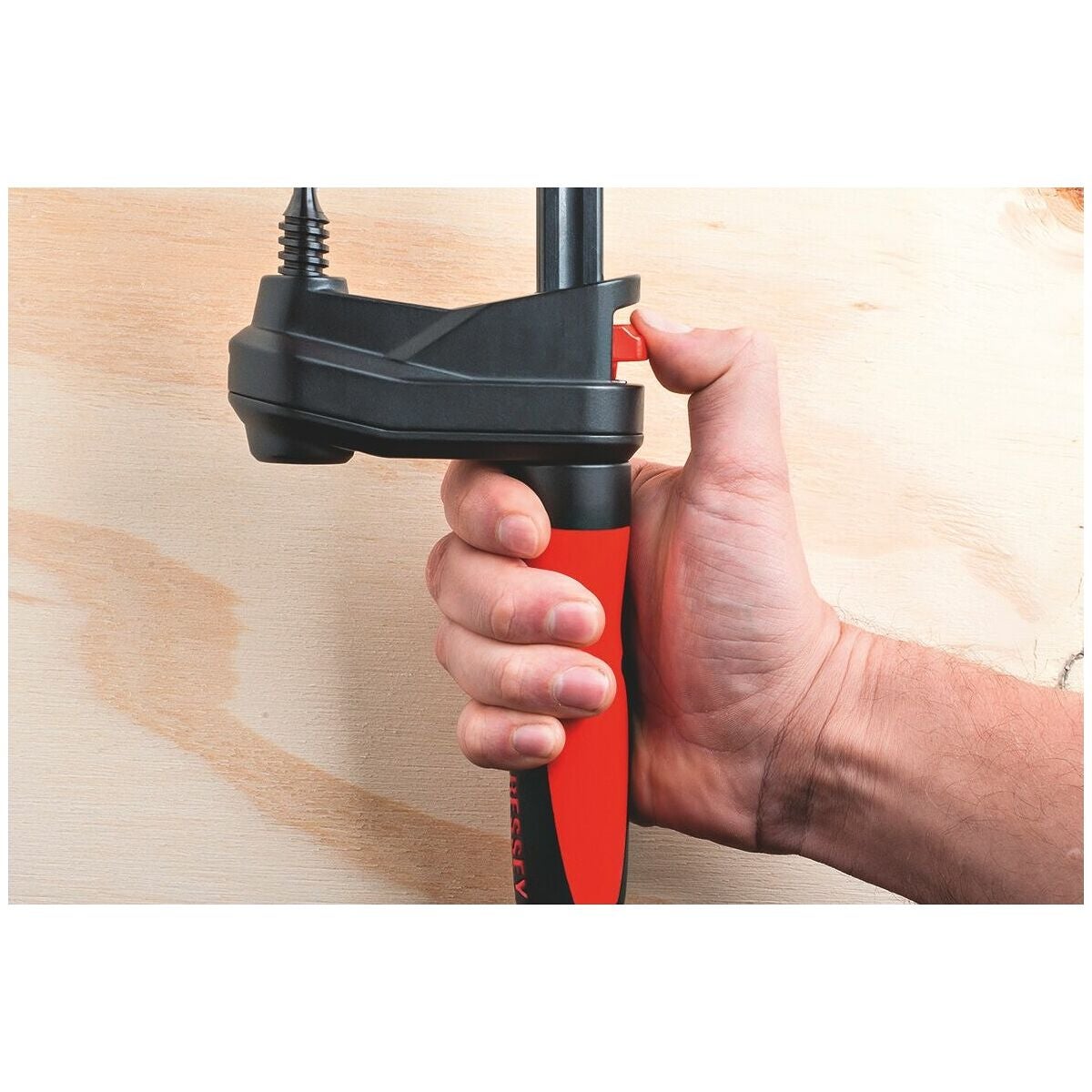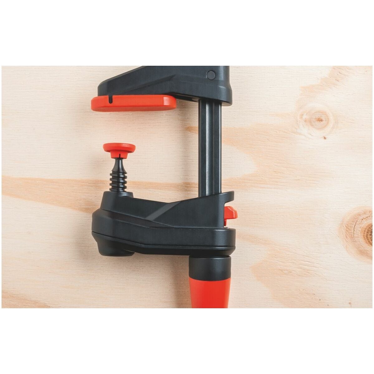 Ergonomiskt utformat handtag i 2-komponentsplast, brunerad skena av draget stål. Glasfiberarmerat plasthölje, lättgående trapetsgängspel med svängbar tryckplatta. Med frigöringsspak för snabbinställning.