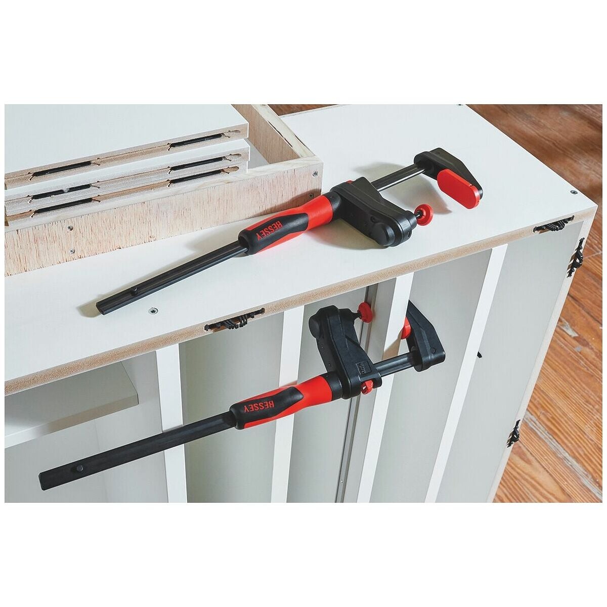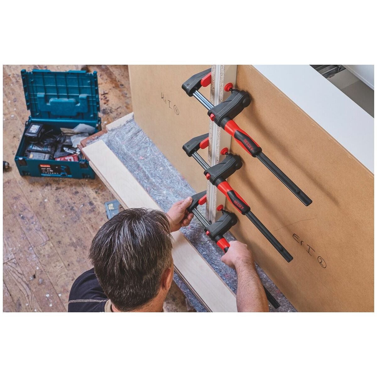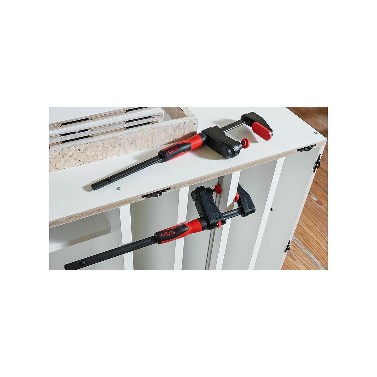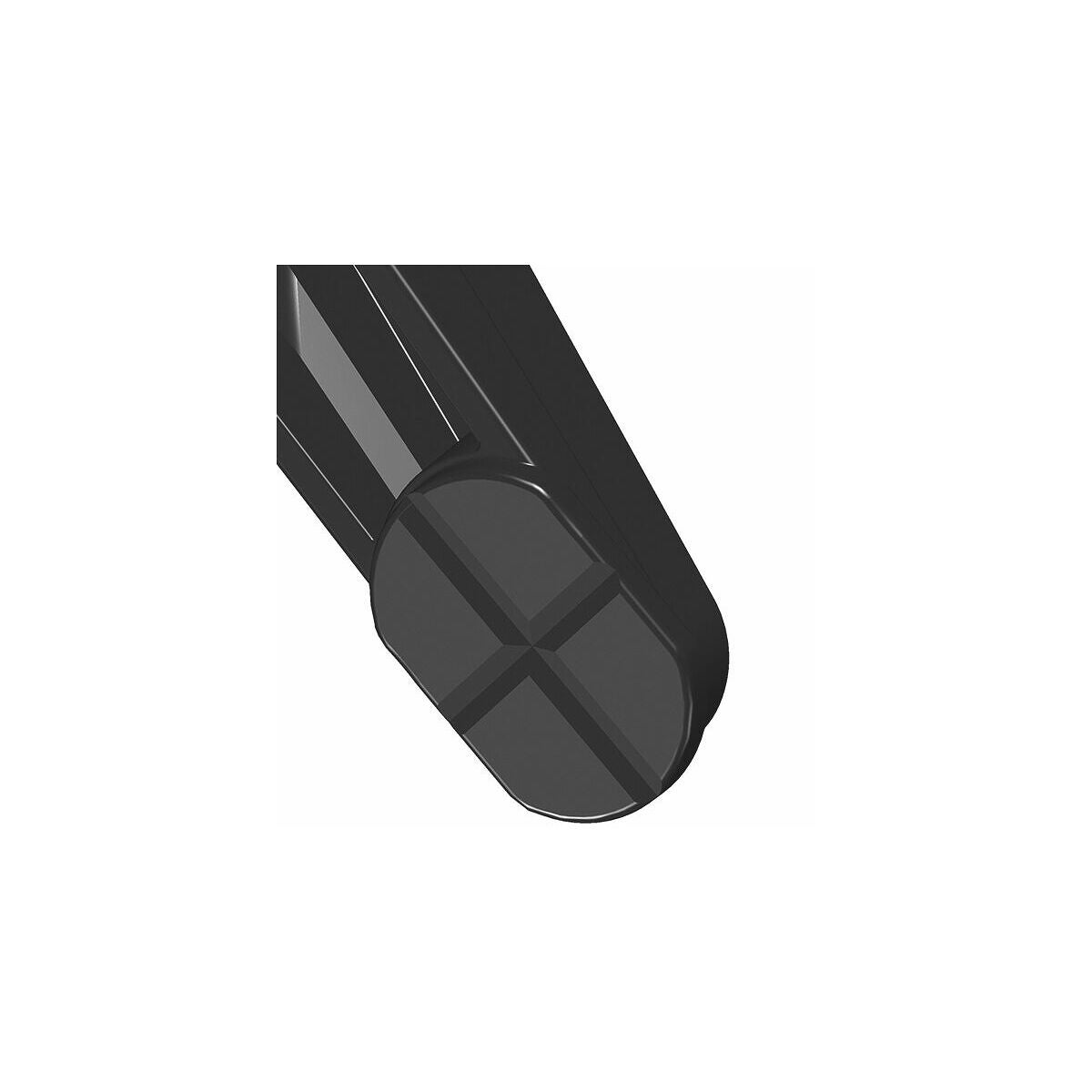 Ergonomiskt utformat handtag i 2-komponentsplast, brunerad skena av draget stål. Glasfiberarmerat plasthölje, lättgående trapetsgängspel med svängbar tryckplatta. Med frigöringsspak för snabbinställning.