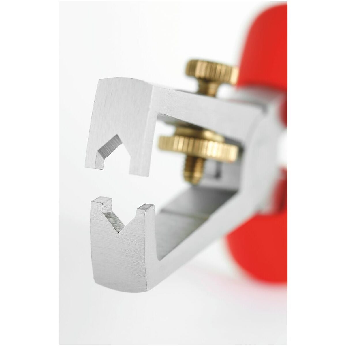 Vinklade käftar med V-formade skär (för max 5 mm ytter-⌀). Infälld led med glappfri gång och returfjäder. Med ställskruv för inställning av ledararea.