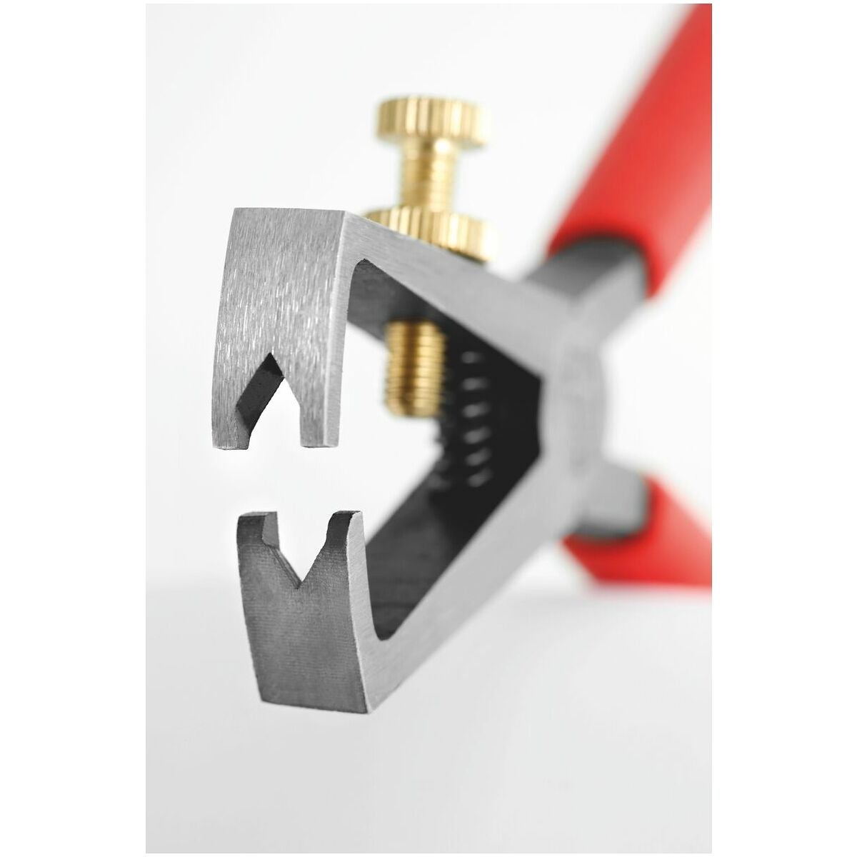 Vinklade käftar med V-formade skär (för max 5 mm ytter-⌀). Infälld led med glappfri gång och returfjäder. Med ställskruv för inställning av ledararea.