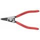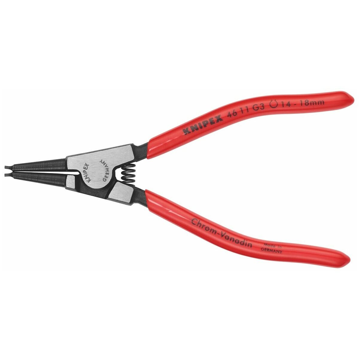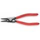 Kemiskt svärtad tång, polerat huvud, plastklädda handtag. Raka, förskjutna spetsar, dvs anpassade till gripringarnas hål. Med returfjäder; G0 med ställskruv.