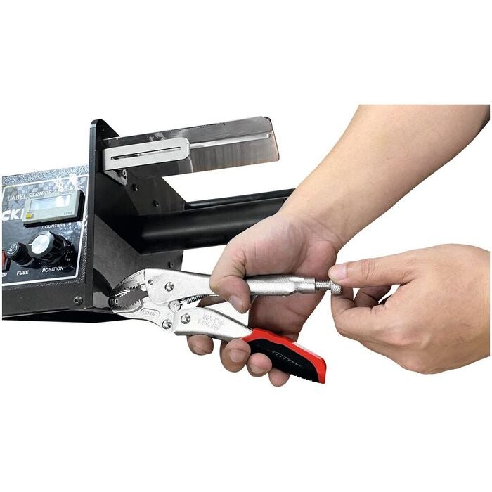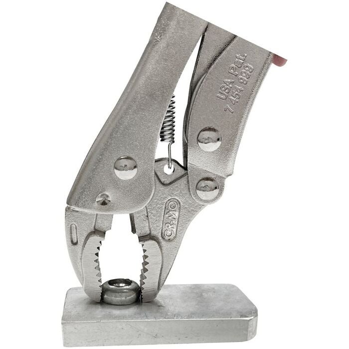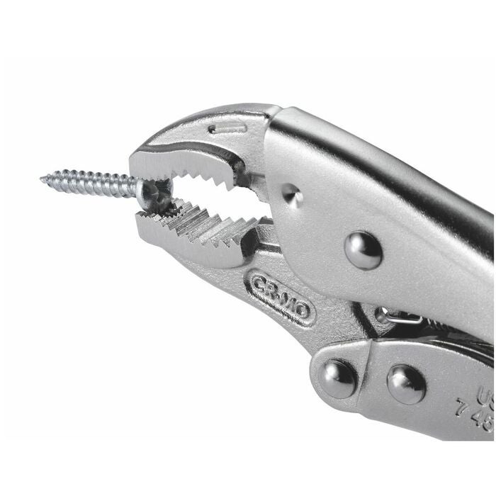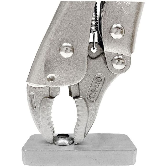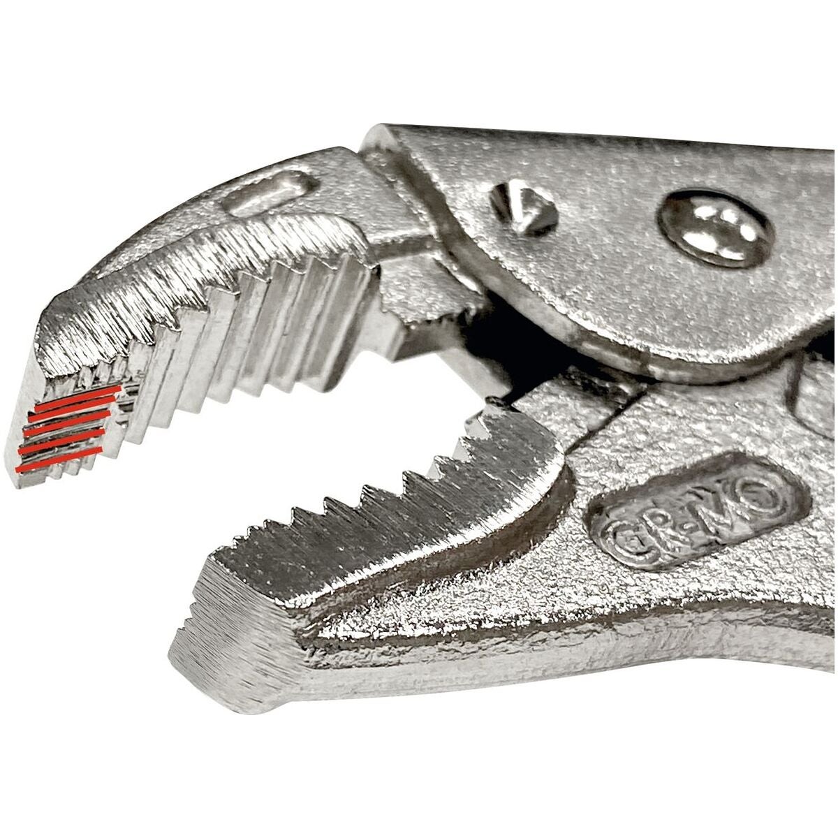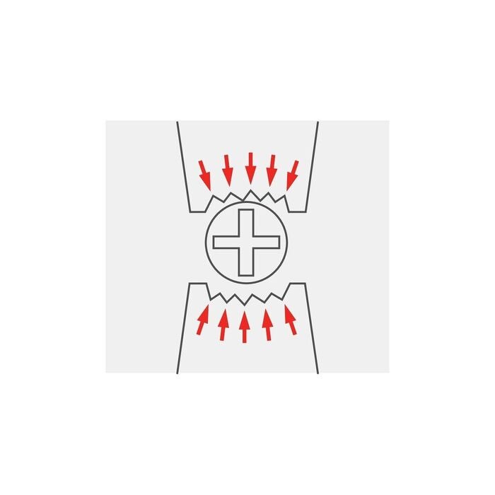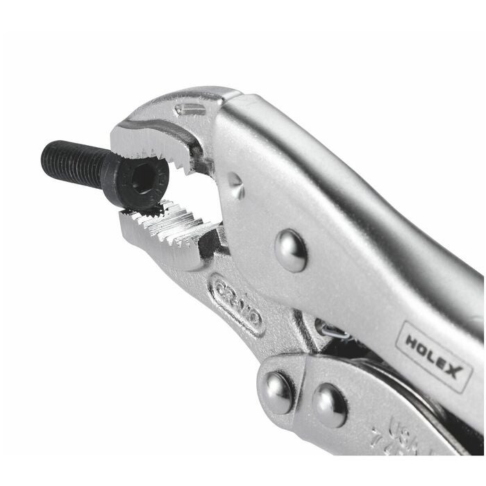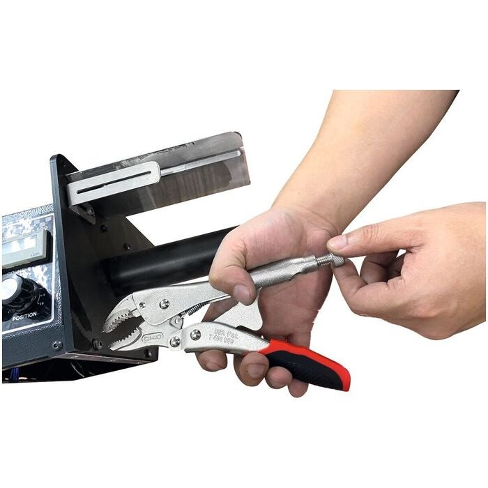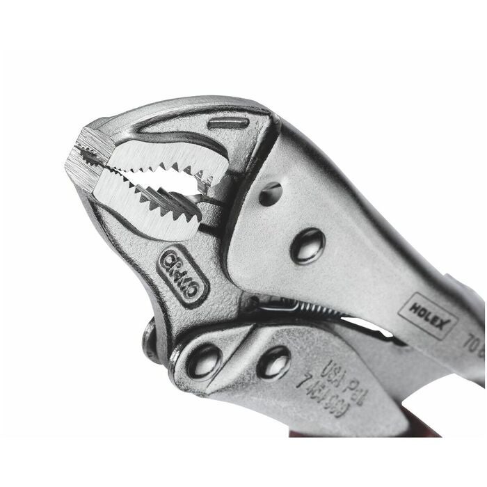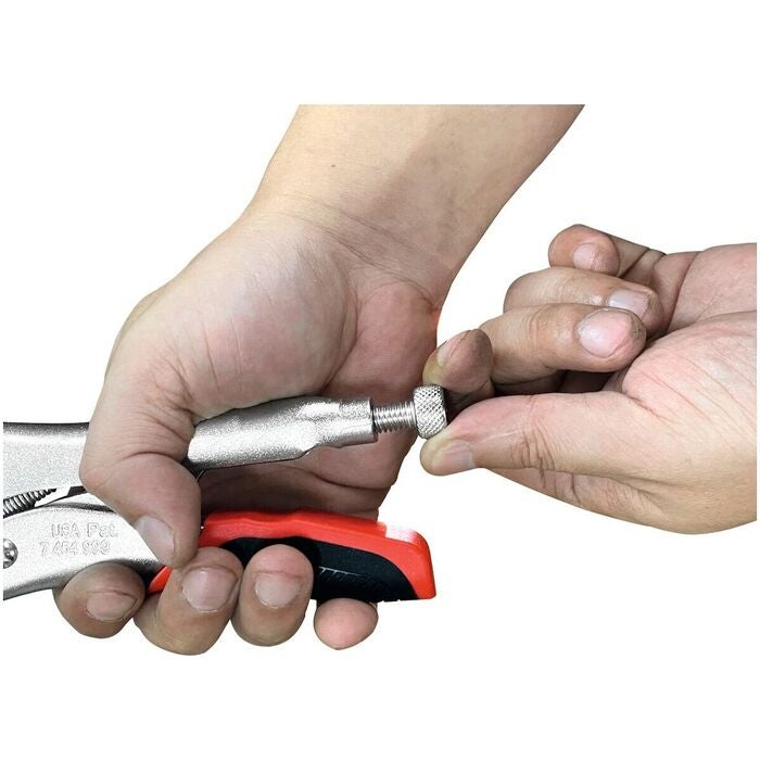 Räfflade käftar och kraftig tångkropp av fjäderstål. Gripvidd och spännkraft inställbara med ratt. Tången är helt förnicklad. Handtag med hylsor av flerkomponentmaterial.