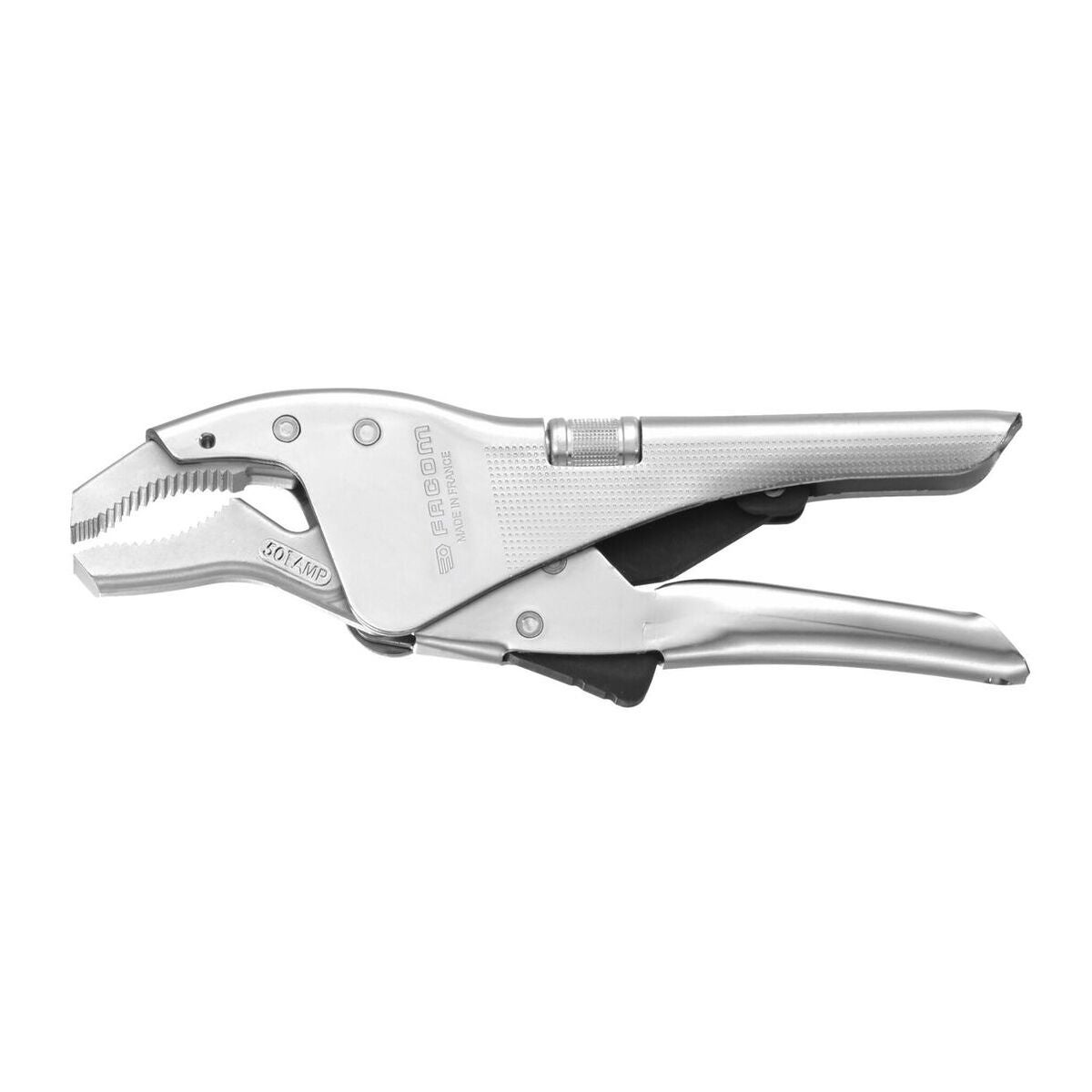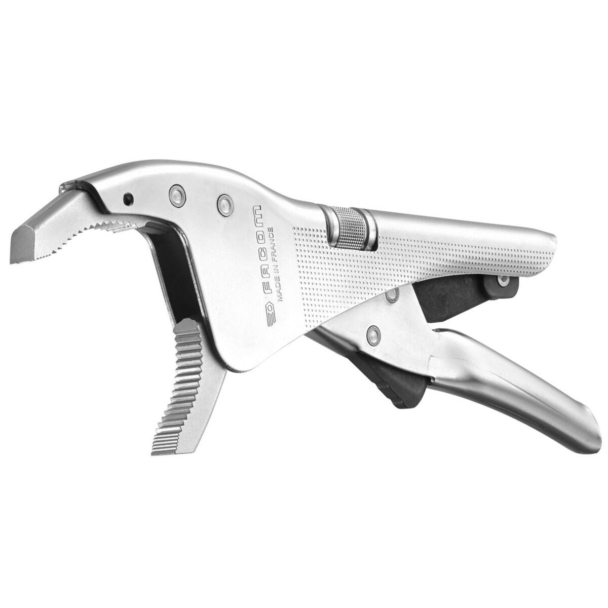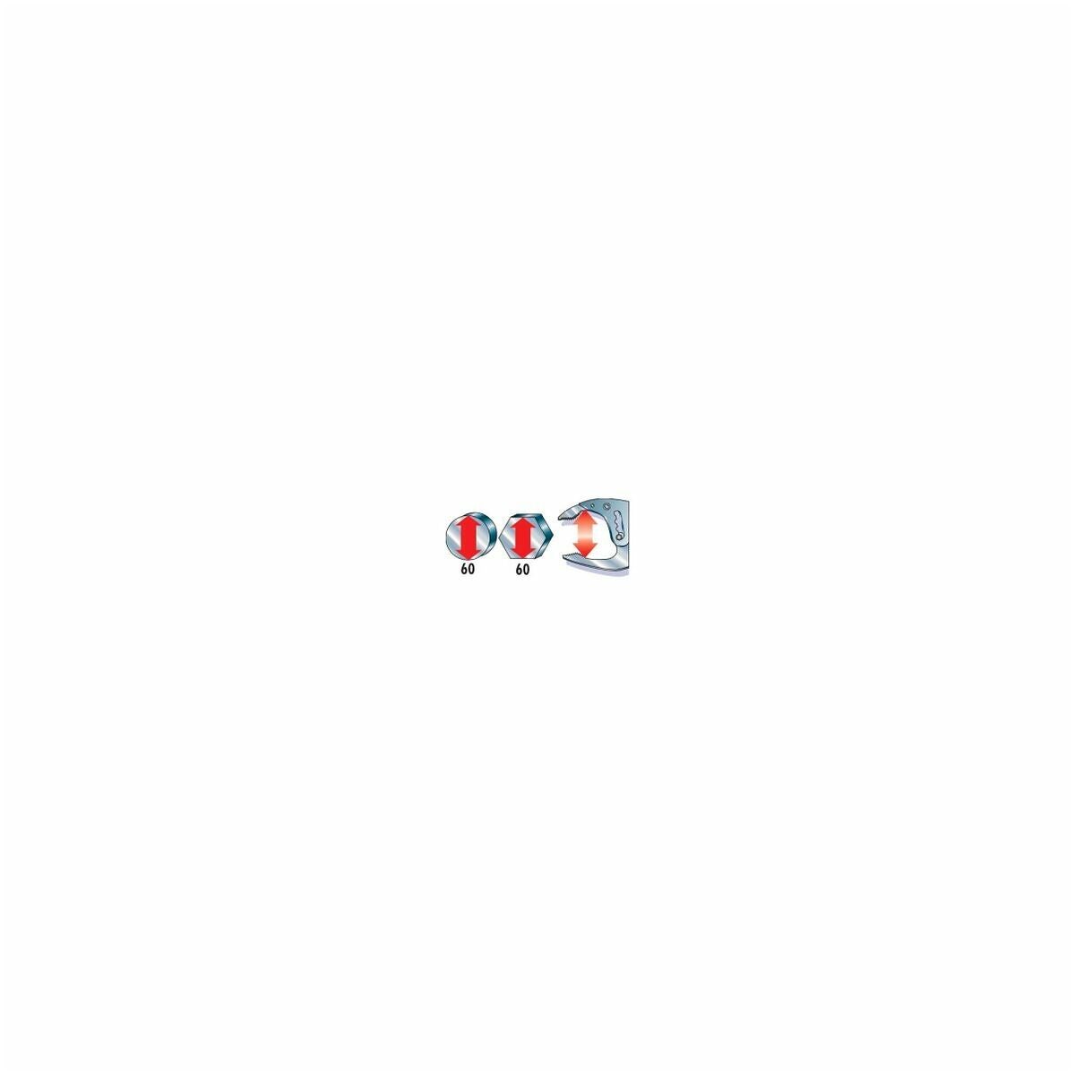 Med enhandsmanövrerad låsning och upplåsning. Tryckknapp för kontrollerad och ryckfri upplåsning. Övre käften med fräst spår för fasthållning av rör med liten diameter.