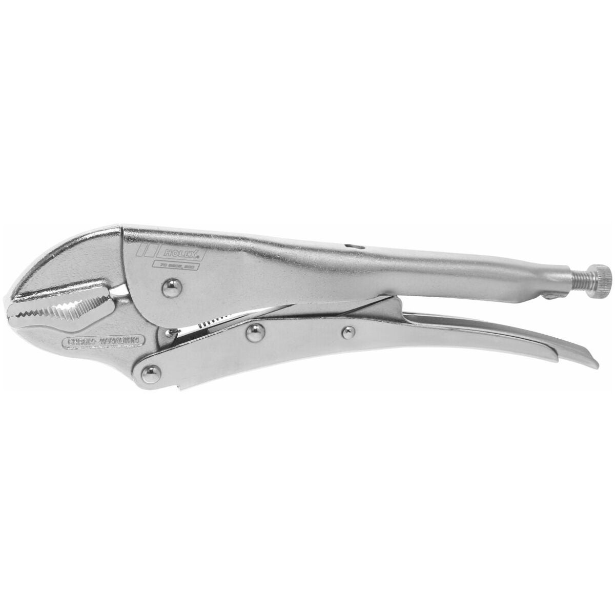 Räfflade käftar och kraftig tångkropp av fjäderstål. Gripvidd och spännkraft inställbara med ratt. Tången är helt förnicklad.