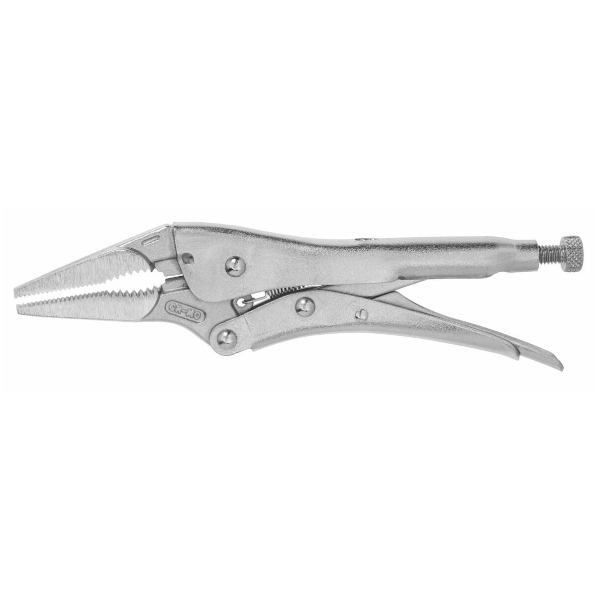 Långa, smala käftar, räfflade på insidan. Inställbar spännkraft, tången helt förnicklad.