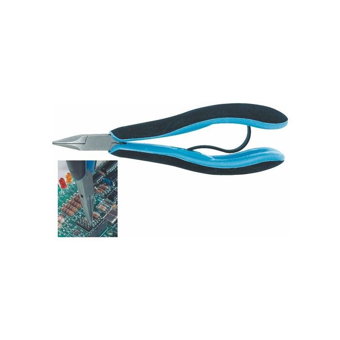 ESD-skyddade, ergonomiska 2K-grepphylsor. Den patenterade returfjädern minskar motståndet då tången stängs. Därigenom kan kraften på arbetsstycket avvägas mycket exakt.