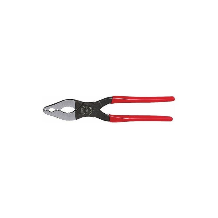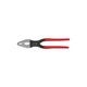 Smalt huvud och räfflade käftar med rörurtag. Kemiskt svärtad tång, polerat huvud, plastklädda handtag.