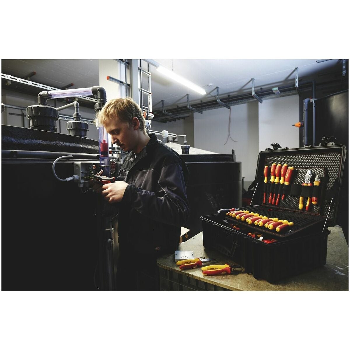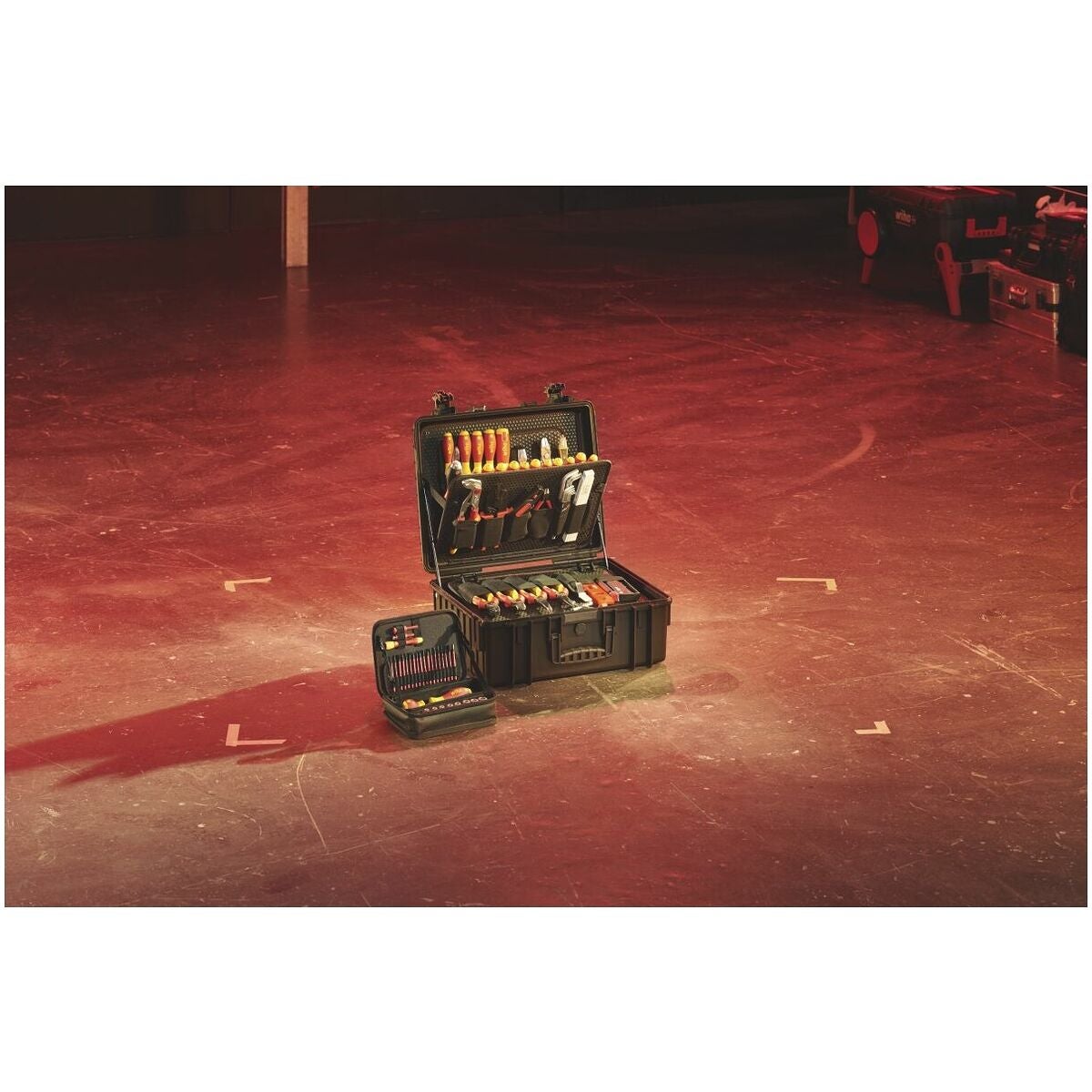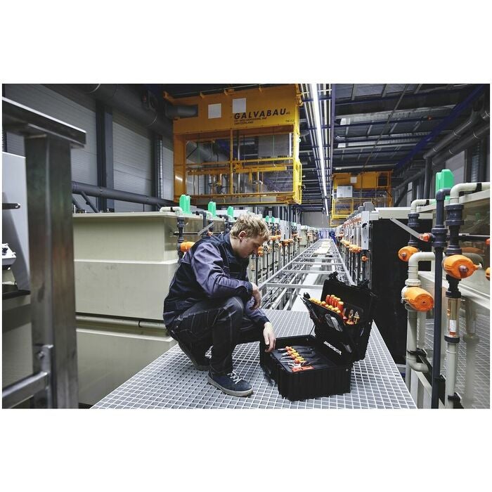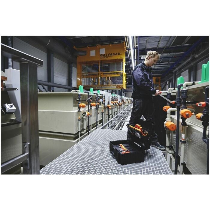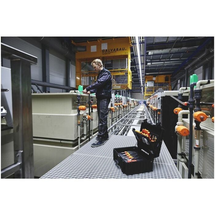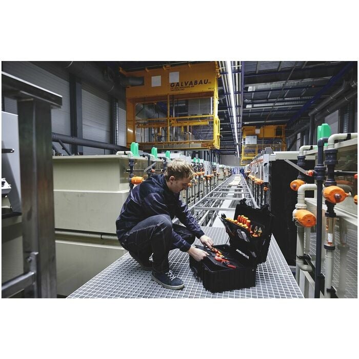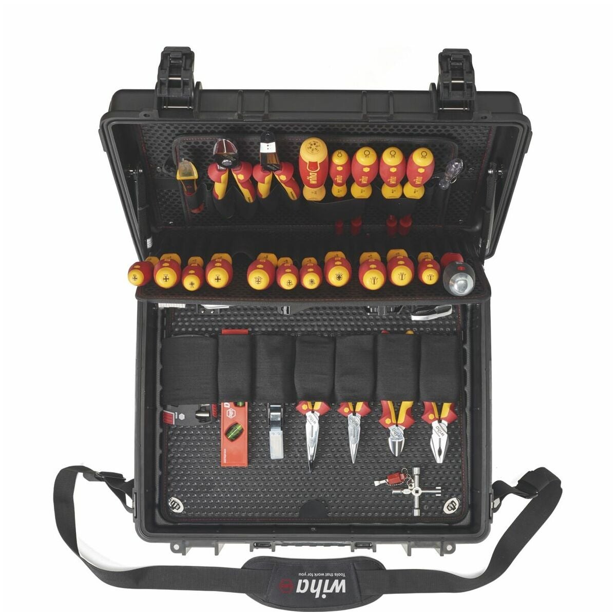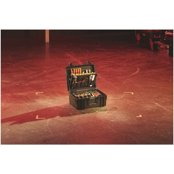 Omfattande elektrikerverktygssortiment i en slagtålig väska av polypropen med bärrem.