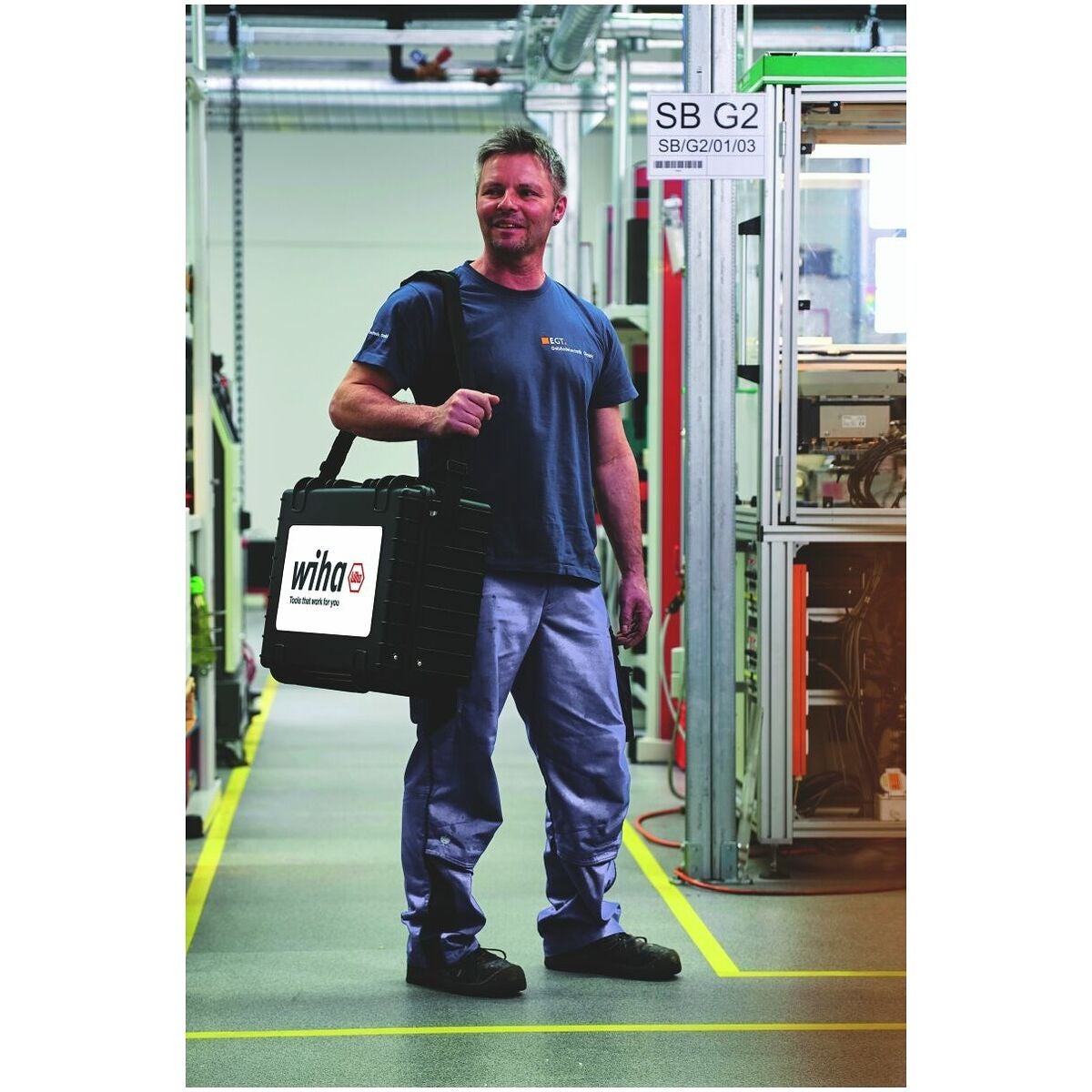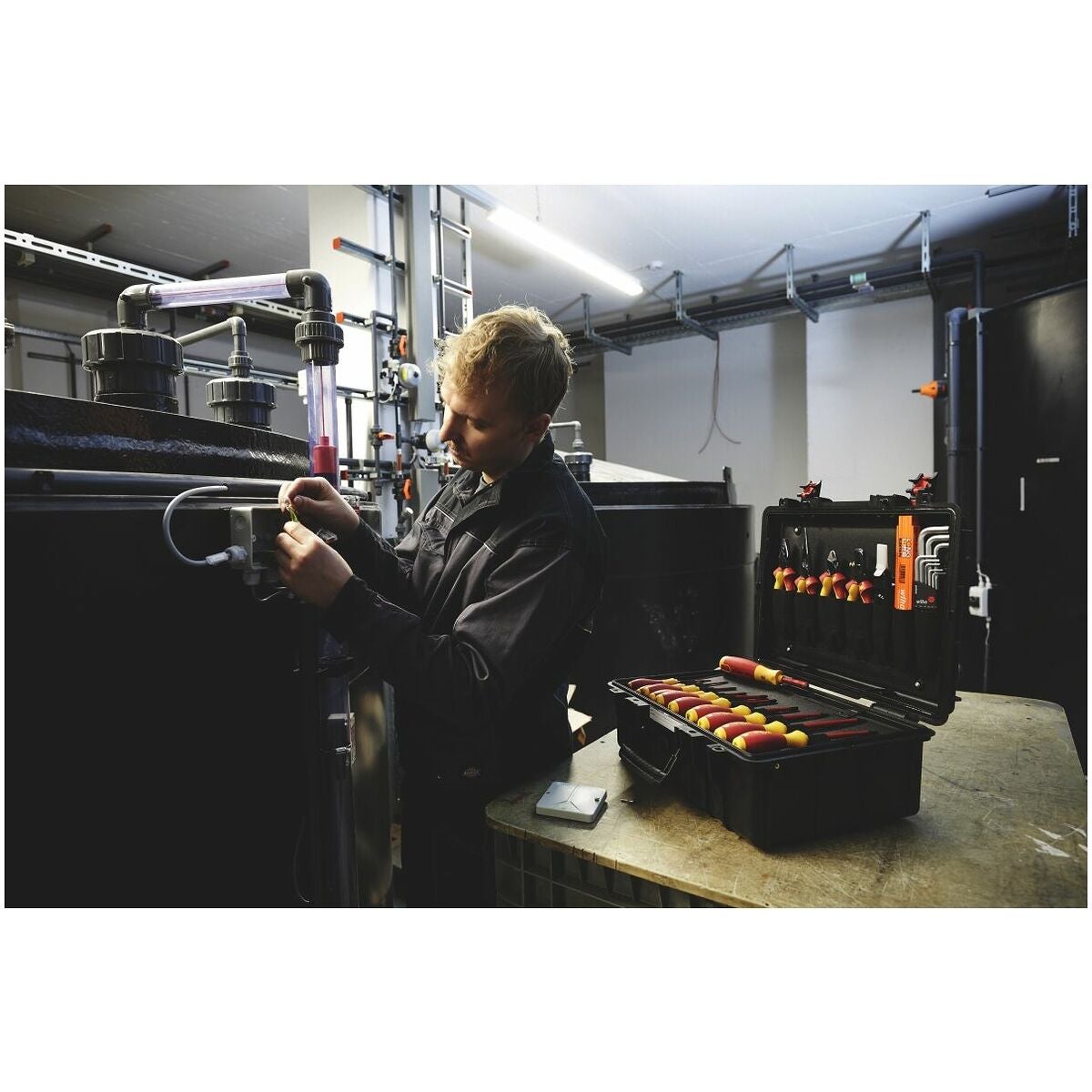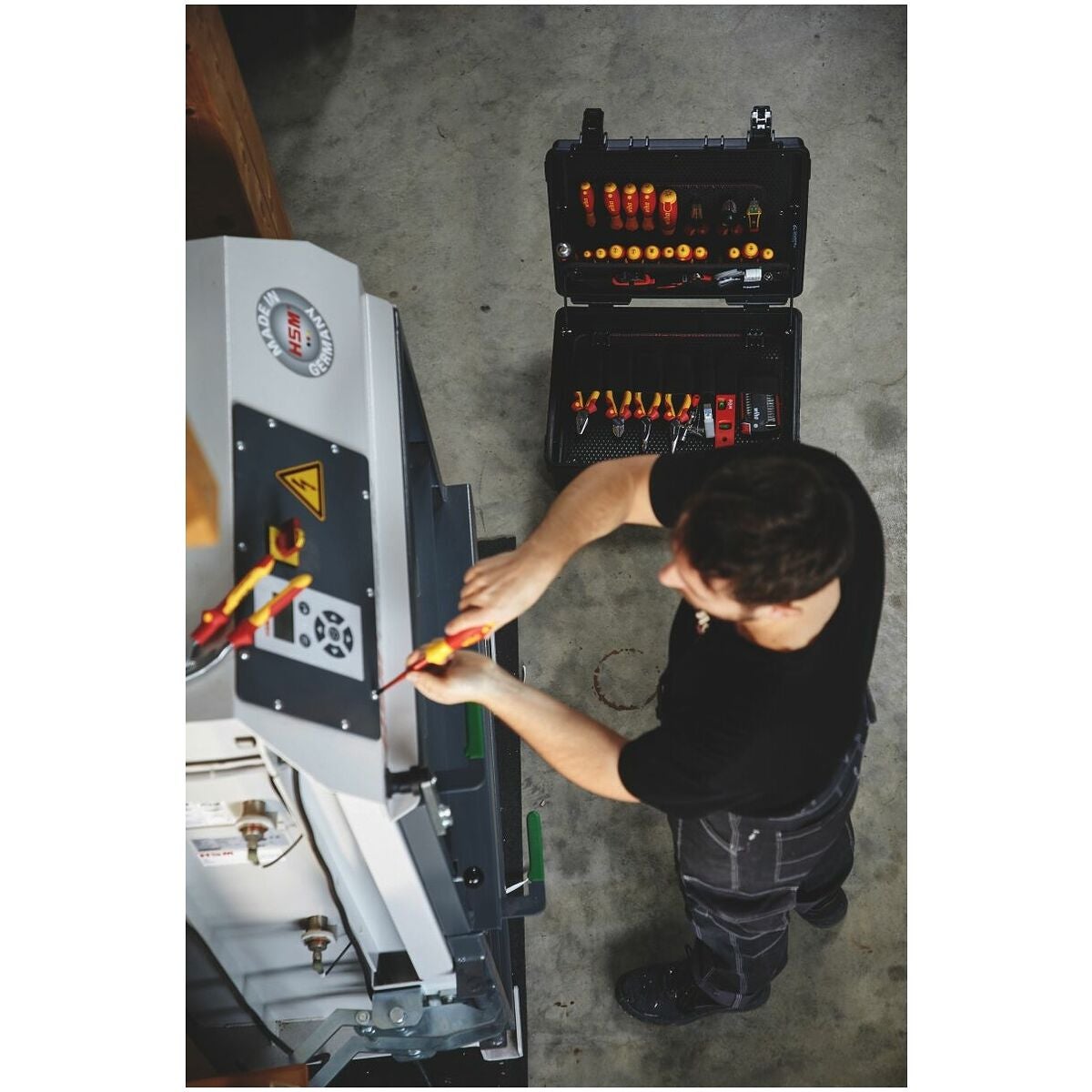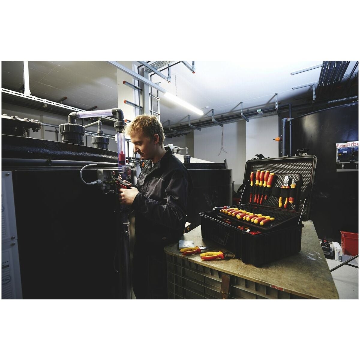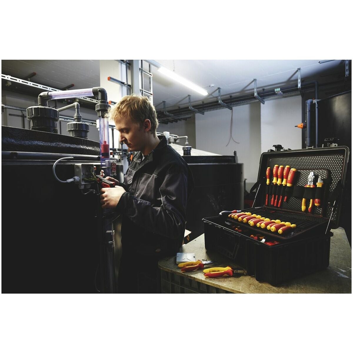 Omfattande elektrikerverktygssortiment i en slagtålig väska av polypropen med bärrem.