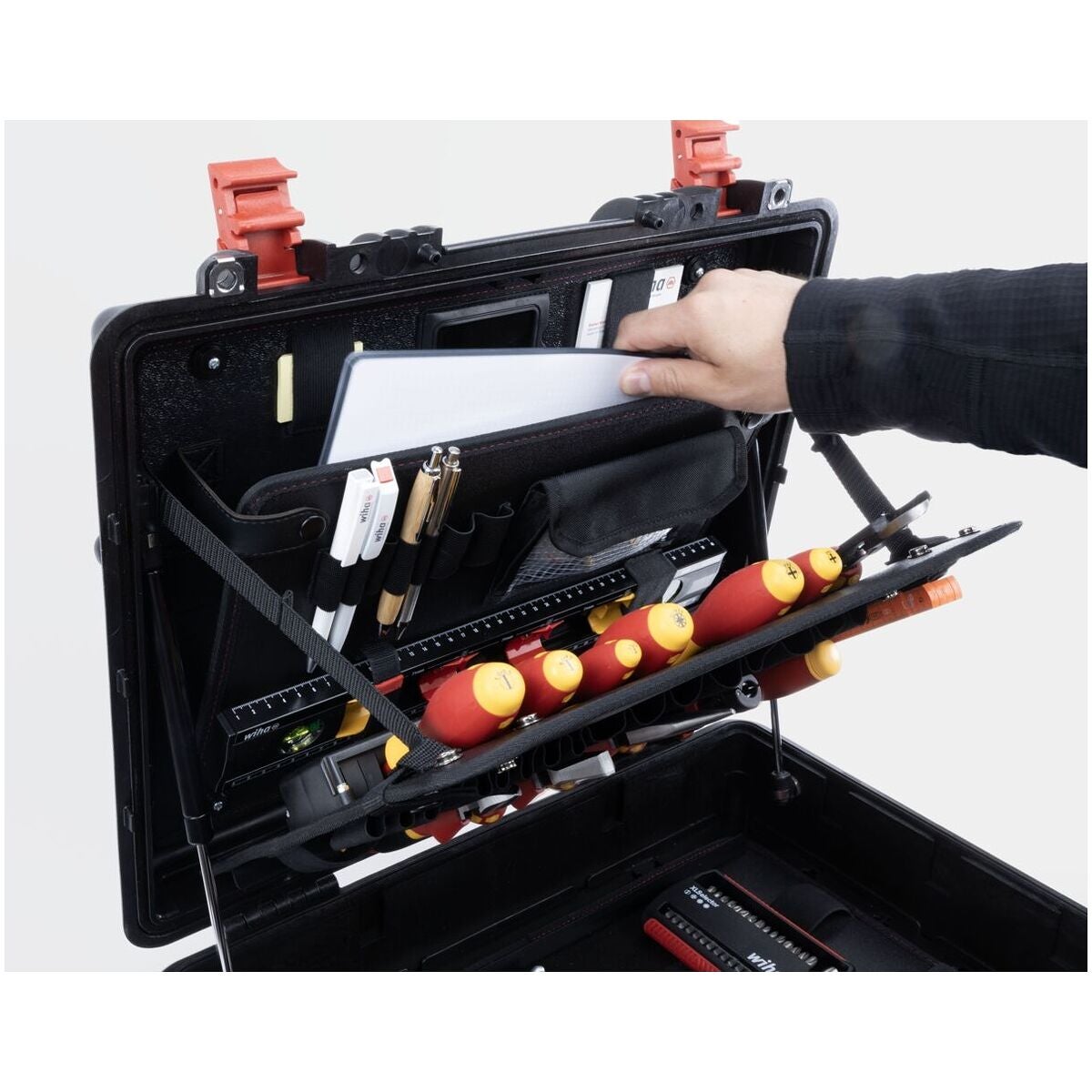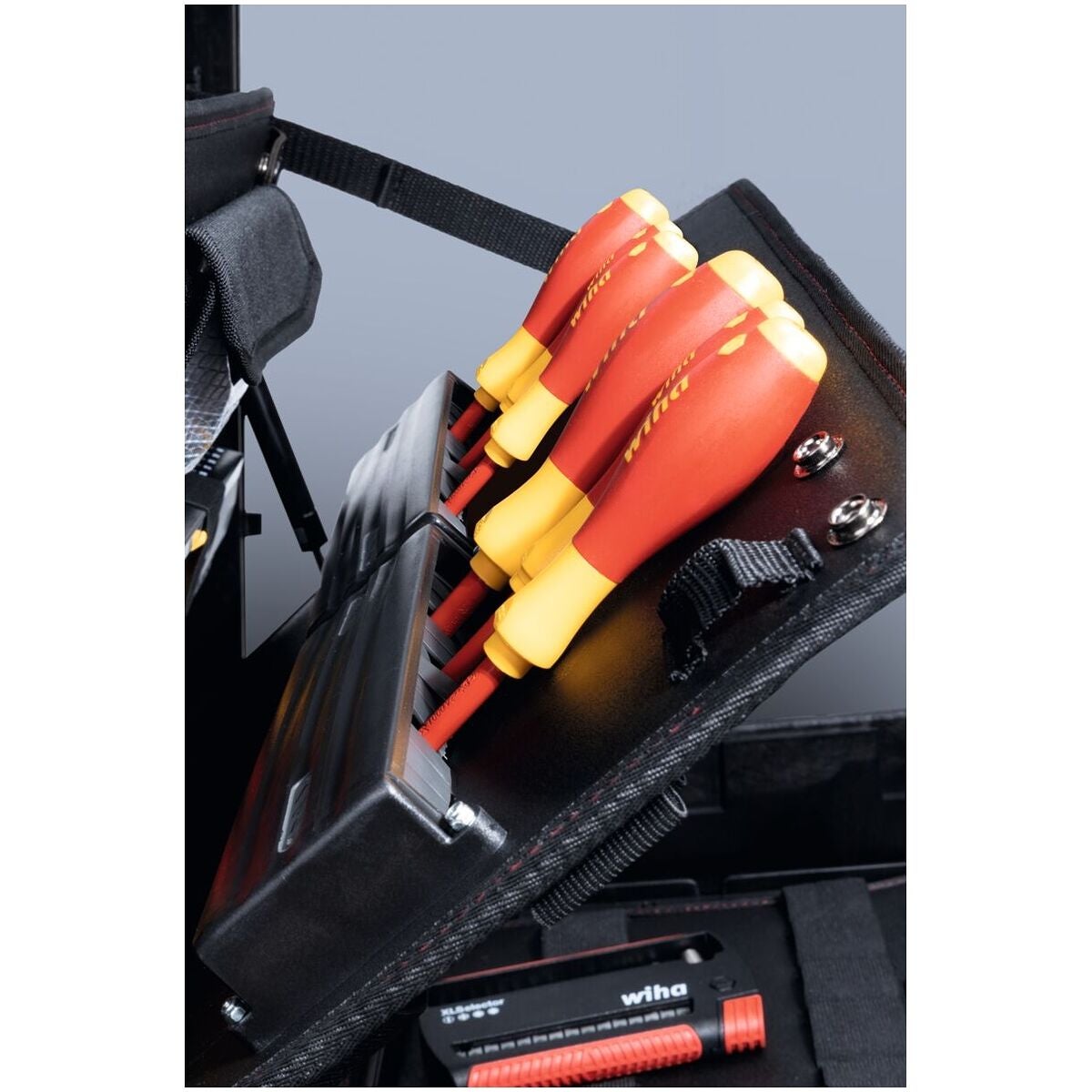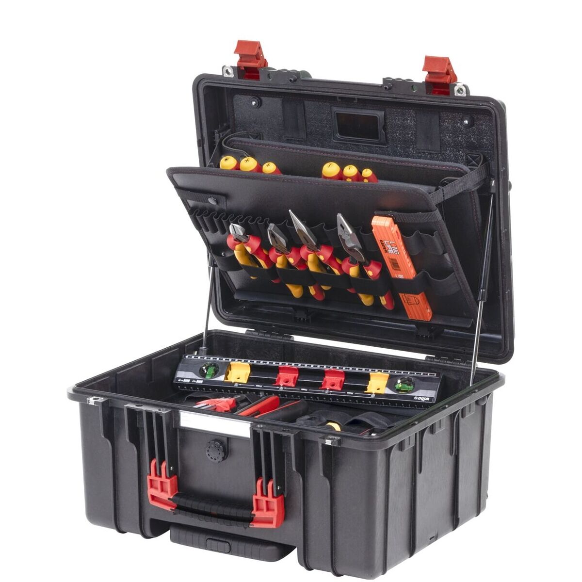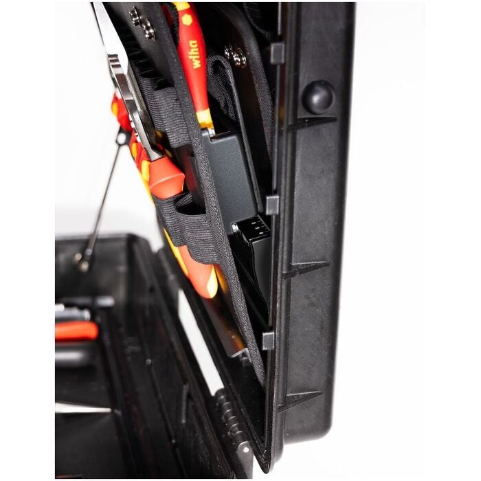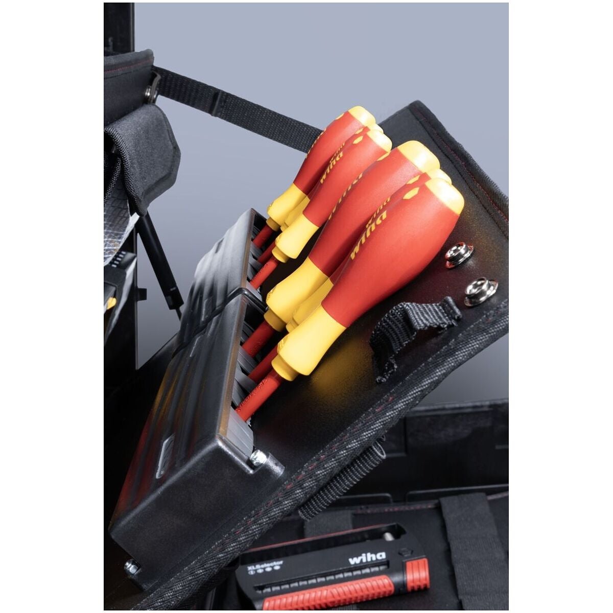 XL 2 Trolley erbjuder ett optimalt förvaringsutrymme och flexibel organisation för mångsidig användning. Med 92 öglor, två insticksmoduler, ett dokumentfack och ett fack för smådelar och individuellt justerbar bottenlayout sörjer för ordning och snabb åtkomst till verktyg. Ergonomiska och isolerade skruvverktyg för säkert arbete på elektriska anläggningar, testade enligt IEC 60900.