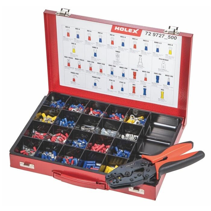 Presstång nr 729720 storlek 6IS och 500 st vanliga kabelskor, stift och skarvdon i stabil metallbox med indelningsfack.