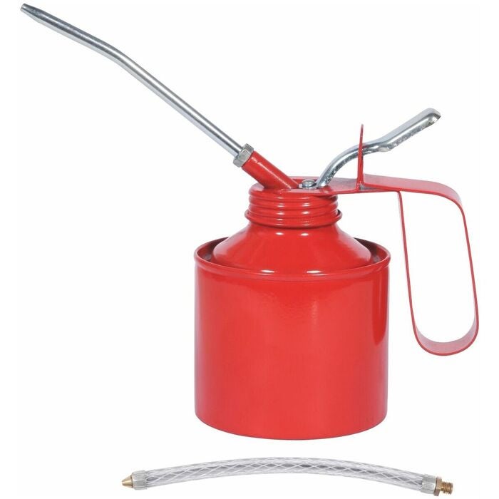 Maskinoljekanna av stål med fast och flexibel pip. Robust mässingspump, avskruvbar pip. Rörlängd 120 mm.