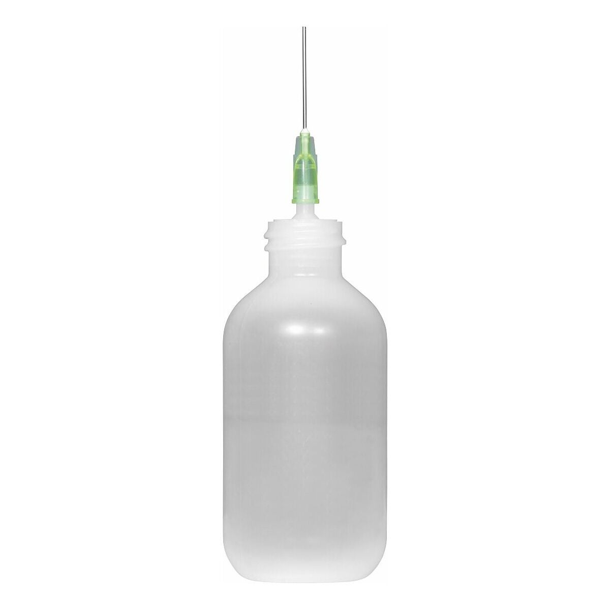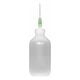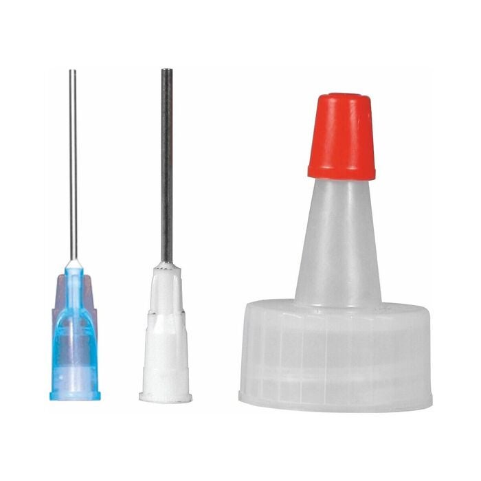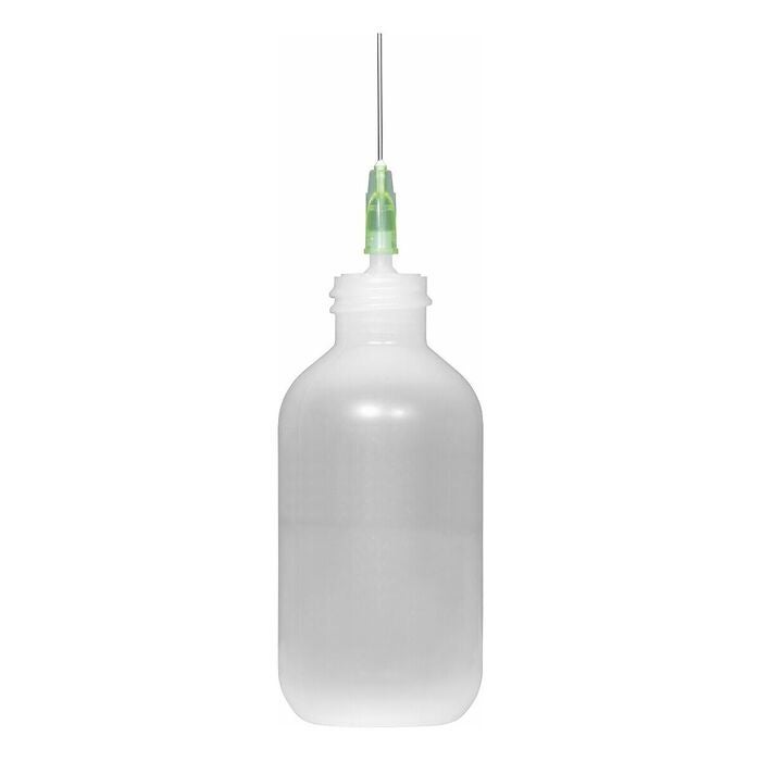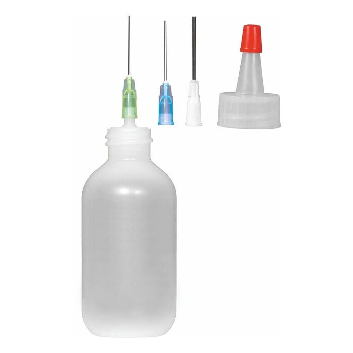 Elastisk, transparent plastbehållare med 3 utbytbara mässingsnålinsatser ⌀ 0,25; 0,5 och 1 mm för exakt dosering av små till måttliga oljemängder.