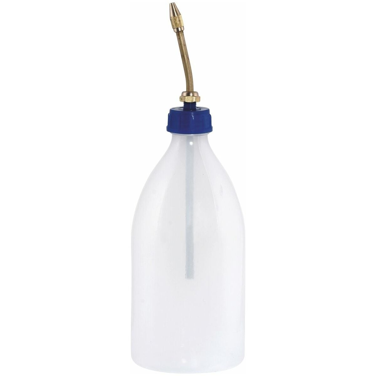Brottsäker, elastisk tryckoljekanna av PE med skjutbar mässingspip och skruvbart lock på pipen. Piphållare med justeringsmutter.