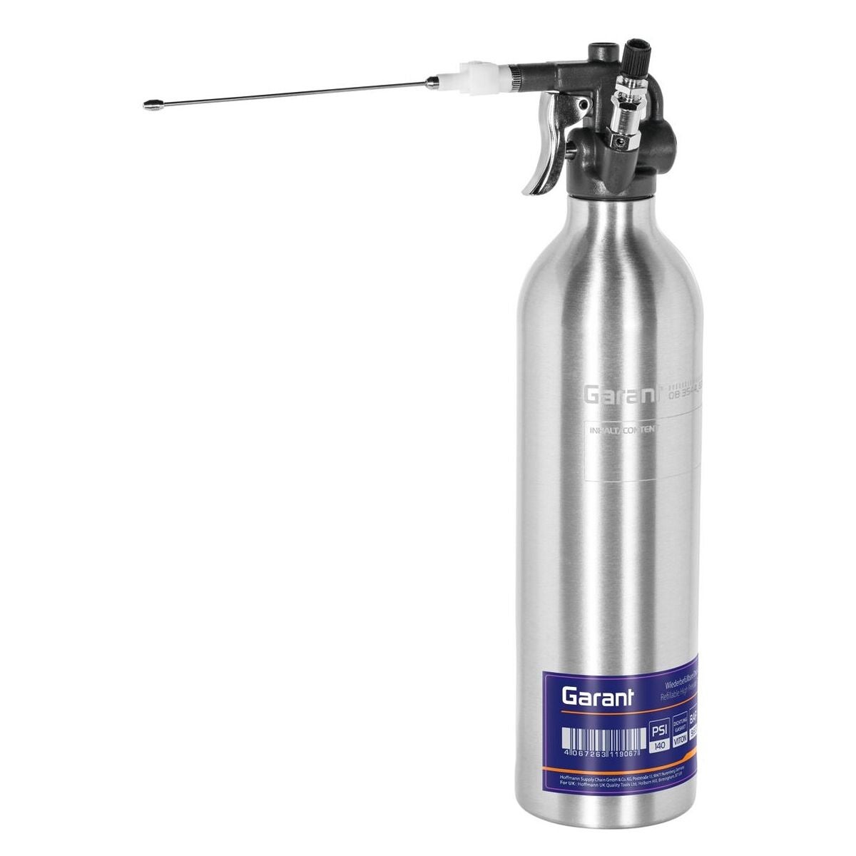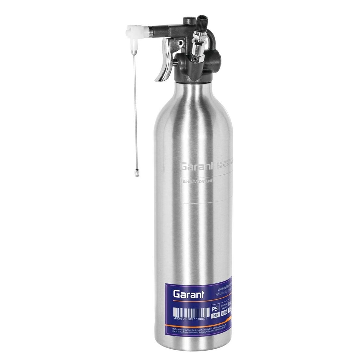 Påfyllningsbar och hållbar tryckluftsbehållare i aluminium som är lämplig för acetonfria vätskor som rengöringsmedel, rostskydd och rostlösare. Kan fyllas på med lufttryck via en universalventil. Har en säkerhetsventil för att förhindra för högt tryck.