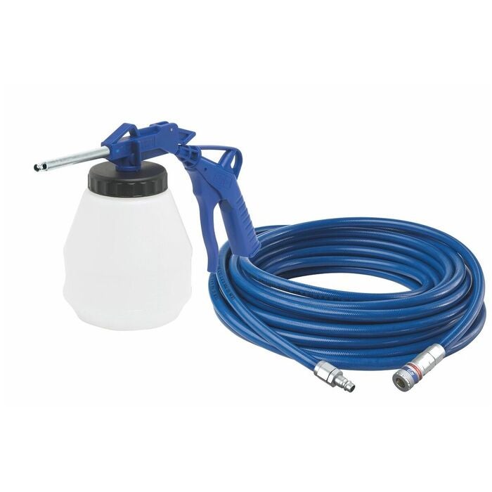 Spraybehållarset med blåspistol. Volym upp till 1,2 liter. Munstycket är utformat för att ge en tät spraydimma. Vätskeflödet och vätske-/luftblandningen kan enkelt justeras.