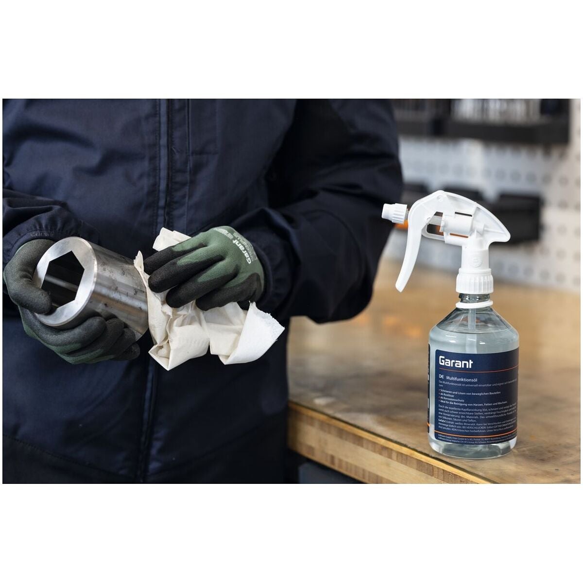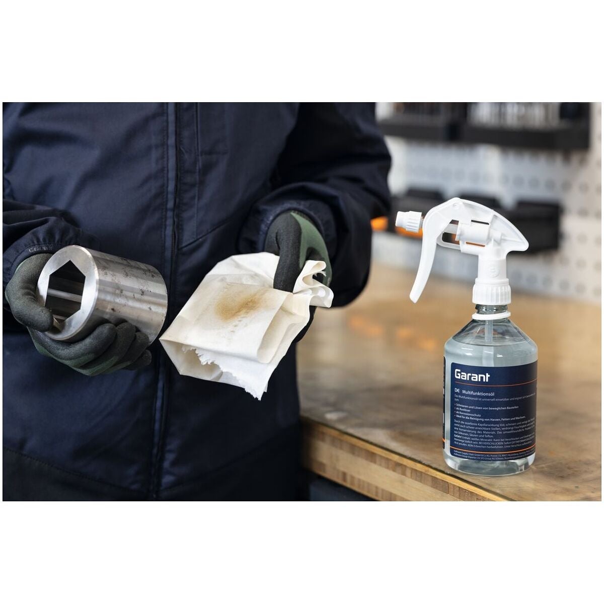 GARANT multifunktionsolja är perfekt för smörjning, rengöring och skydd. Tack vare sin utmärkta kapillärverkan tränger den djupt in i de minsta luckorna, löser upp envis smuts och sörjer för en grundlig rengöring. Samtidigt bildar den en tillförlitlig smörjfilm som förhindrar korrosion, tar effektivt bort rost och härdar inte. Den mångsidiga sprayen är idealisk för borttagning av fasthärdade fetter och oljor och för smörjning av många olika komponenter. Dessutom skyddar den mot rost och läckströmmar, vilket gör den perfekt för verktyg, maskiner, elektroniska kopplingar och motorer. GARANT multifunktionsoljan är fri från syror, silikoner och teflon.