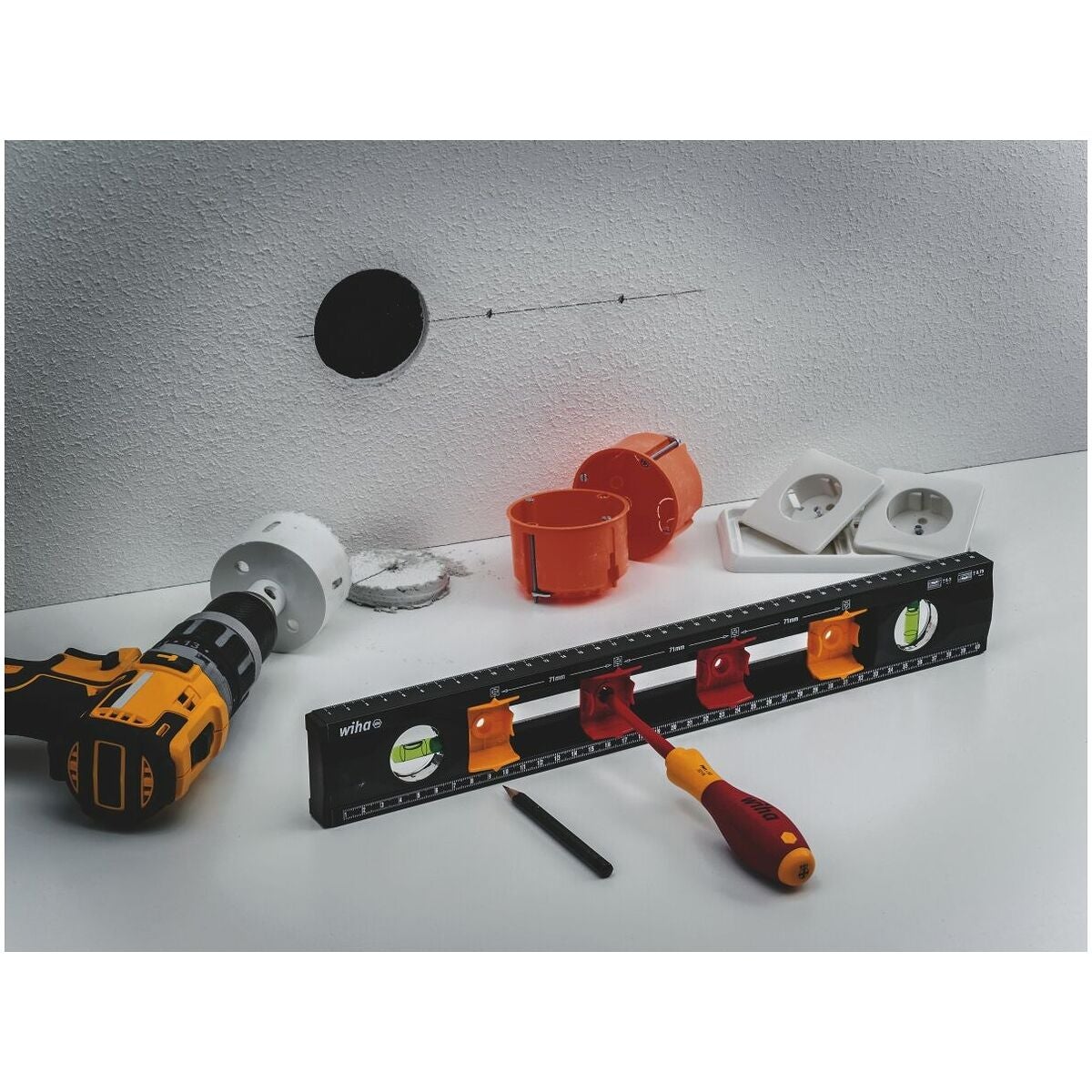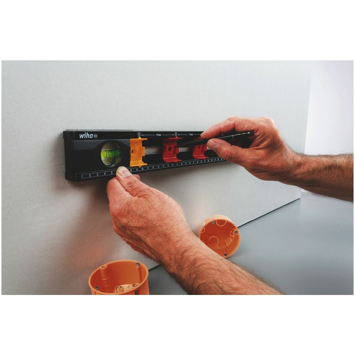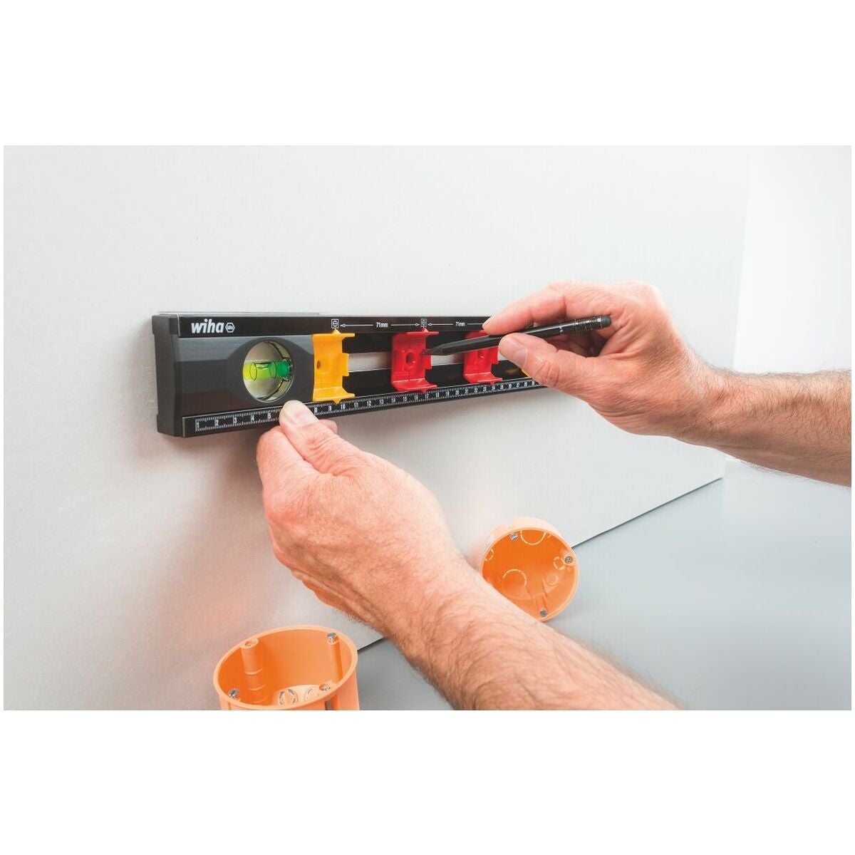 För horisontell och vertikal mätning och märkning av avstånden för infällda lådor.