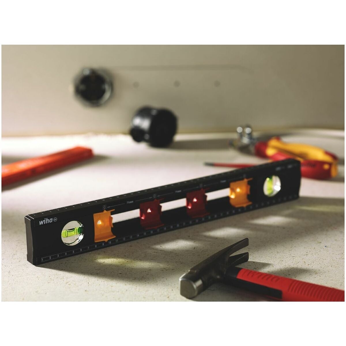 Markeringar med variabelt avstånd för upp till 4 infällda lådor. Bekväm dimensionering med topp vy tack vare sofistikerad skalning. Kåpa för avbrottsfri linjemärkning. Perfekt synlighet av båda nivåindikeringarna, även i en skarp vinkel.