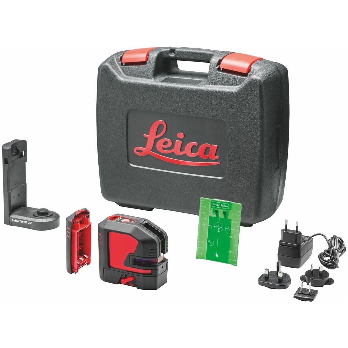 Inklusive adapter, litiumjonbatteri, laddare, batterihållare, måltavla och låda.