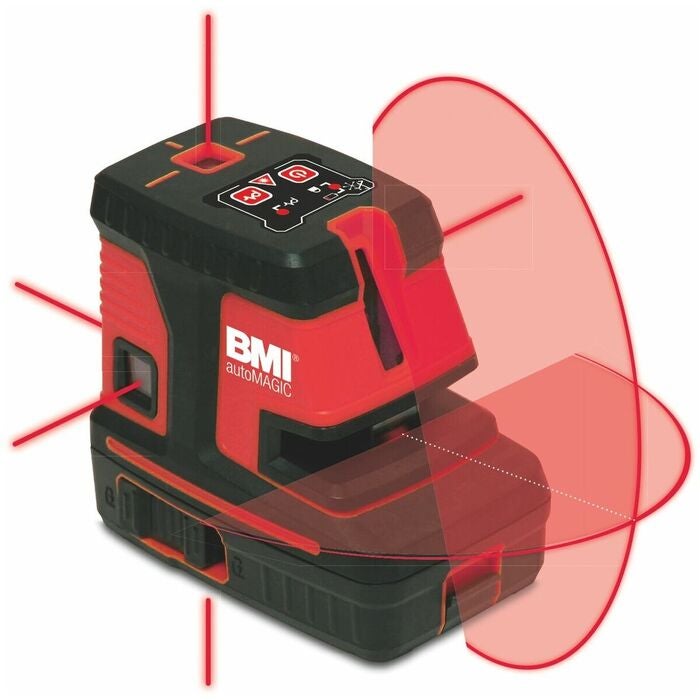 Krysslinje- och 5-strålslaser i ett och samma verktyg, självnivellerande med magnetiskt dämpat pendelsystem. Pulserade laserlinjer horisontellt och vertikalt med separat eller gemensam inkoppling. Lodlaser uppåt och nedåt, 3 horisontella laserstrålar framåt, åt vänster och åt höger, alla strålar i 90° vinkel mot varandra. Låsbar för avbildning av 'sneda linjer' och för transportskydd.
