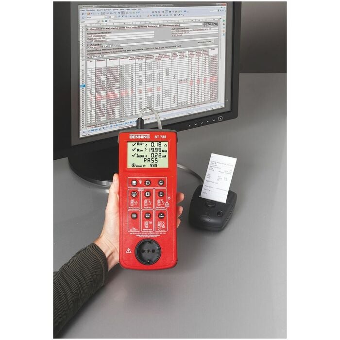 Mätvärdesminne för 999 provningsobjekt kan avläsas via micro-USB-gränssnittet. Nedladdningsprogram för utarbetande av kontrollprotokoll i MS Excel. Integrerad realtidsklocka för lagring av mätvärden med kontrolldatum. Skyddsledar-/beröringsström via differensströmmätning, direkt mätmetod (nätdrift) och reservmätning av urladdningsström (batteridrift).