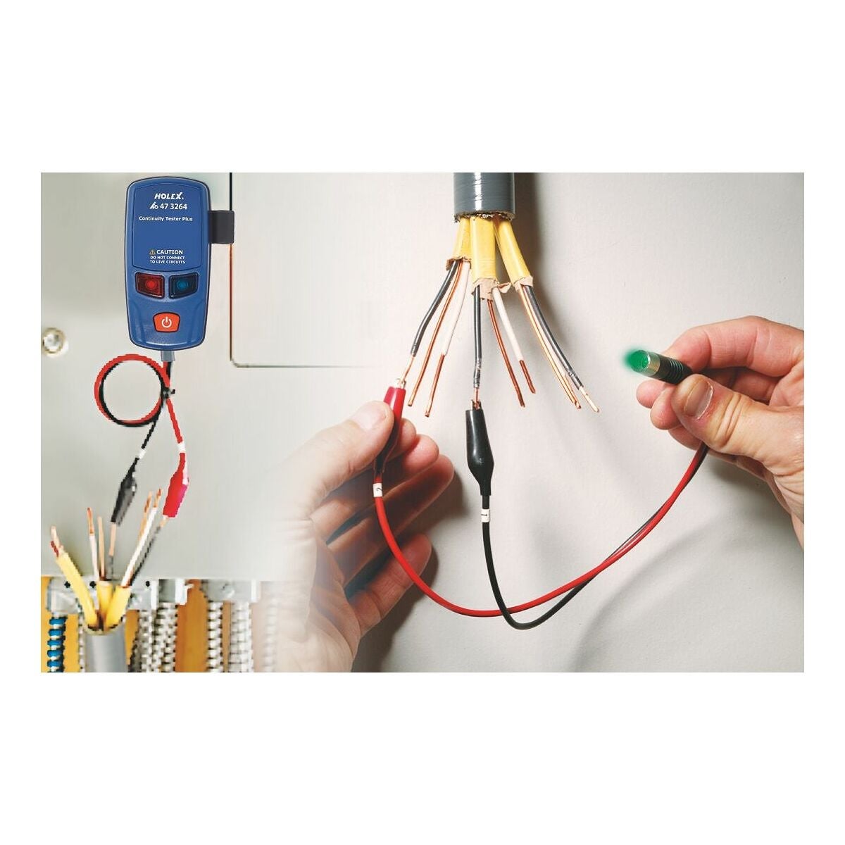 Kompakt instrument i stabilt tvåkomponentshus med optisk och akustisk indikering. Krokodilklämmor för enklare hantering. Separat indikeringslampa (rött och grönt) för kontinuitets- och polaritetsprovning på större avstånd. Överspänningsskydd 250 V.