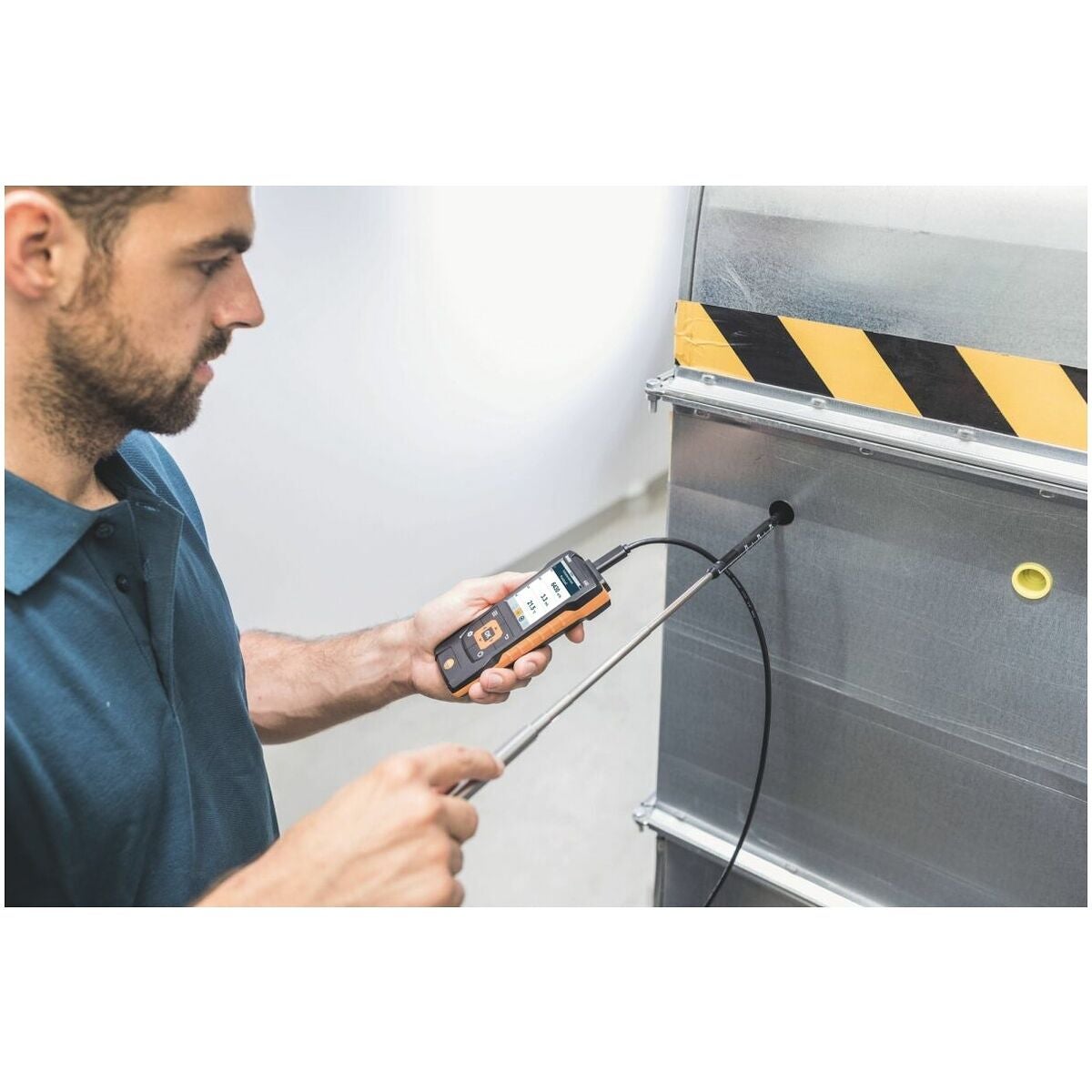 Klimatmätare Testo 440 för mätning av flödeshastighet och flöde i ventilationskanalen (m/s, m3/h).