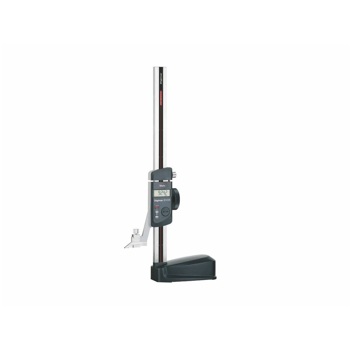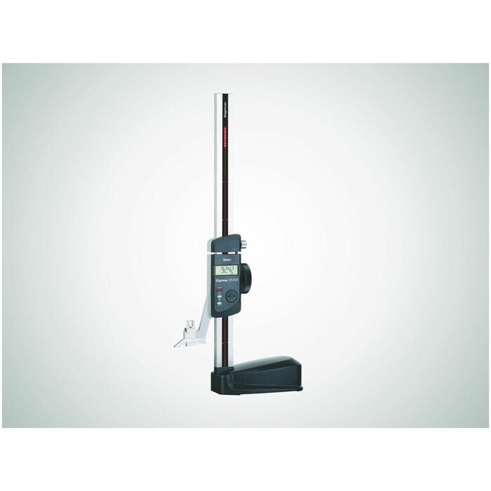 Kontrastrik, 12 mm hög LCD-display. Ergonomisk, stabil fot med härdad och läppad upplagsyta som gör att den kan förskjutas lätt och utan ryck. Löpare och skena av härdat, rostfritt stål. Stor ratt för positionering och mätning. Extra fininställning och låsskruv.