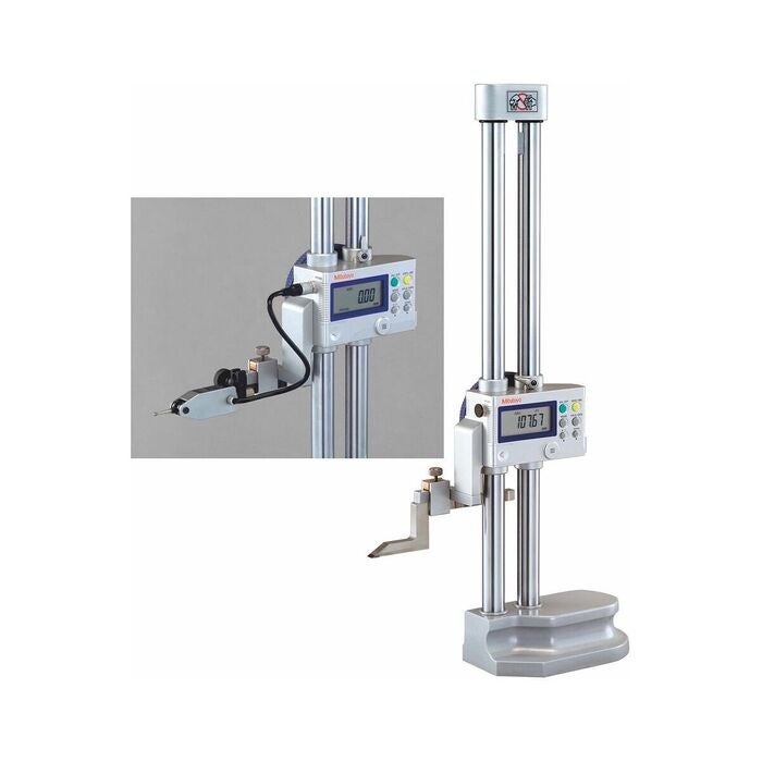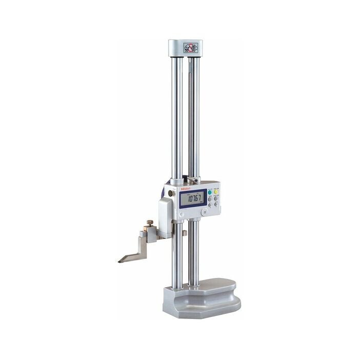 Ritsnål med hårdmetallspets. Robust fot med härdad och läppad stödyta. På baksidan av displayhuset finns en vev för snabbinställning och en ratt för fininställning.