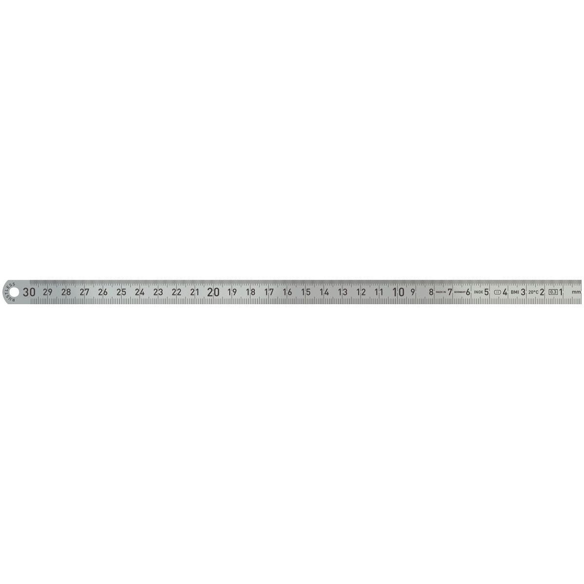Utförande Av rostfritt fjäderstål. Tydliga, elektrolytiskt graverade, svarta skalstreck och siffror med slät yta. Lättavlästa. Rundade kanter för skydd mot skador. Översida med ½ mm skaldelning och undersida med 1 mm skaldelning. Skala från höger till vänster.
