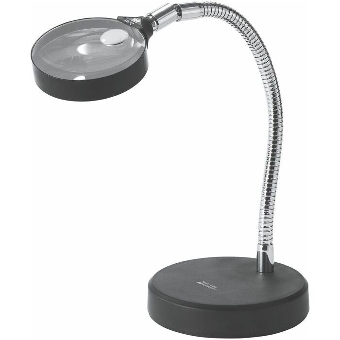 Aplanatisk silikatglaslins i lågreflekterande mässingsfattning med anlöpningsskikt. Sockel i massivt gjutgods med svart plastmantel. Flexibel, 300 mm lång metallsvanhals.