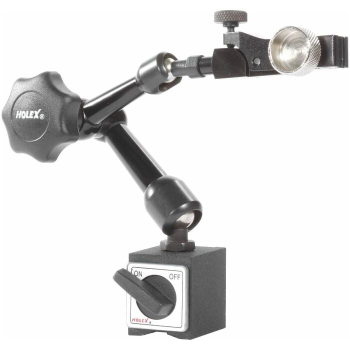 Mekaniskt magnetmätstativ med mekanisk centrallåsning. Alla tre länkarna låses fast med endast ett vridhandtag. Steglöst reglerbar klämkraft med hög stabilitet. Kulleder möjliggör snabb och enkel positionering. Magnetfot med vred och V-spår i botten.