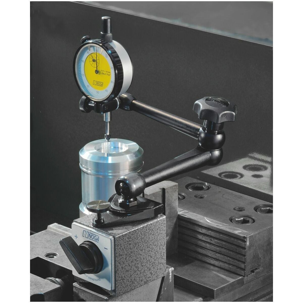 Mekaniskt magnetmätstativ med mekanisk centrallåsning. Alla tre länkarna låses fast med endast ett vridhandtag. Steglöst reglerbar klämkraft med hög stabilitet. Kulleder möjliggör snabb och enkel positionering. Magnetfot med vred och V-spår i botten.