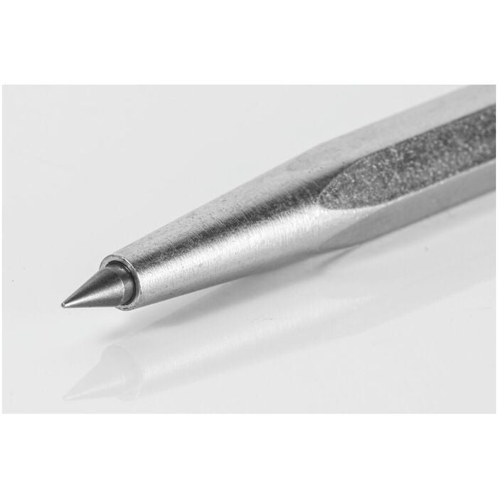 Hårdmetallritsnål med extremt hög slitstyrka. Mycket noggrann ritslinje tack vare 30° vinkeln och hårdmetallspetsens specialgeometri. Sexkanthandtag 6 mm. Rak form.