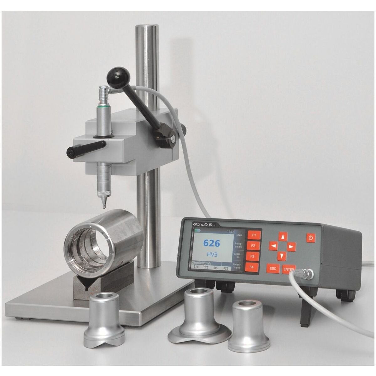 Det mobila UCI-provinstrumentet alphaDUR II kan anslutas till sonder enligt DIN 50159-1 utgåva 2008-10, ASTM A 1038 och VDI/VDE-riktlinje 2616 samt studshårdhetsprovare typ D enligt DIN 50156 och ASTM A956. Mätningen av intrycket sker under provbelastning. De anslutna sondernas provbelastning känns av automatiskt. Enkel menystyrning tack vare stor, högupplöst färgdisplay. Kan lagra 50 materialkalibreringar och upp till 500000 mätdata med datum, klockslag, material och utvärdering. Utvärderingar med flera statistikfunktioner.