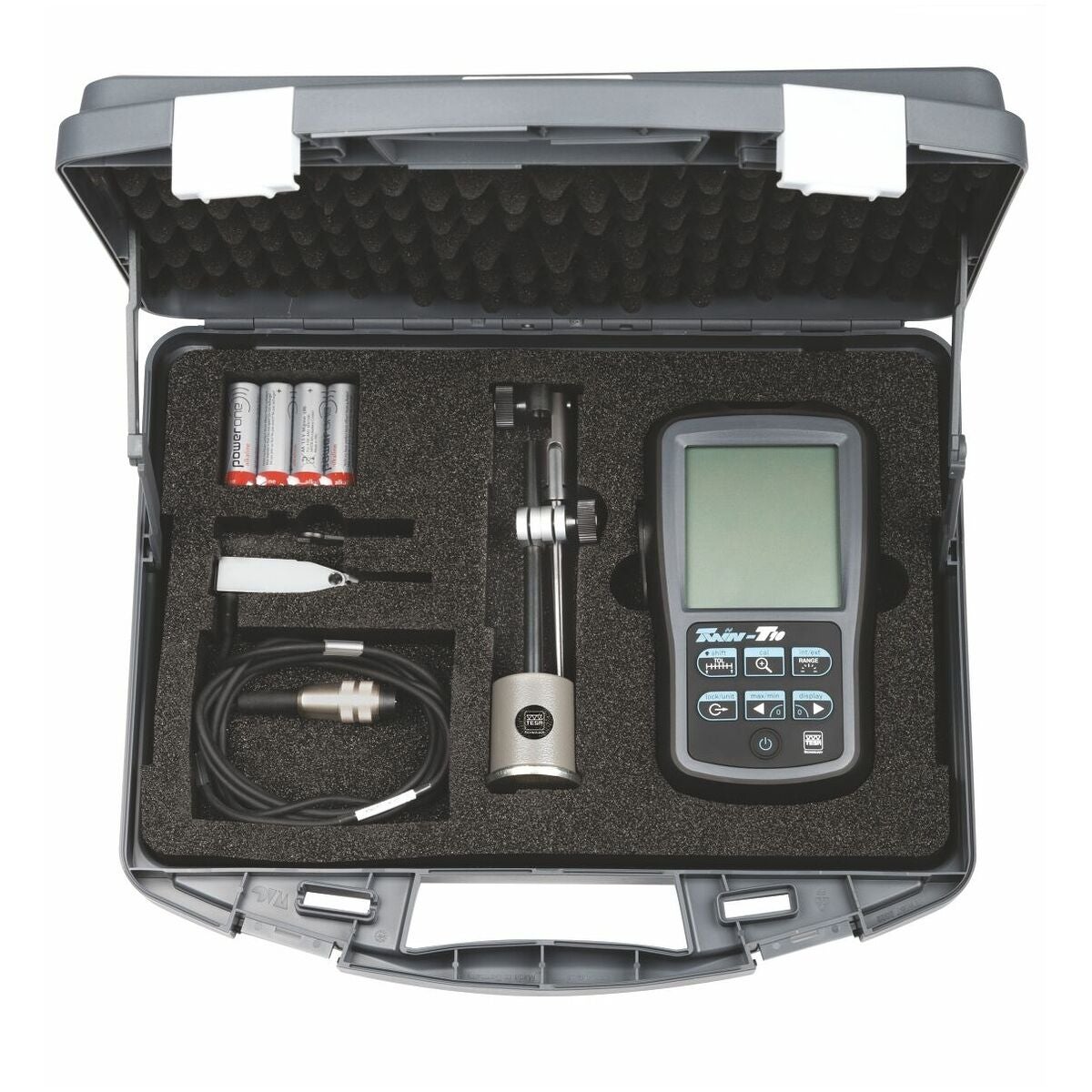 Inklusive bruksanvisning, bärbar display TWIN-T10 nr 434716 storlek T10, 4 st batterier nr 081561 storlek LR6, Klein-magnetmätstativ, väska.