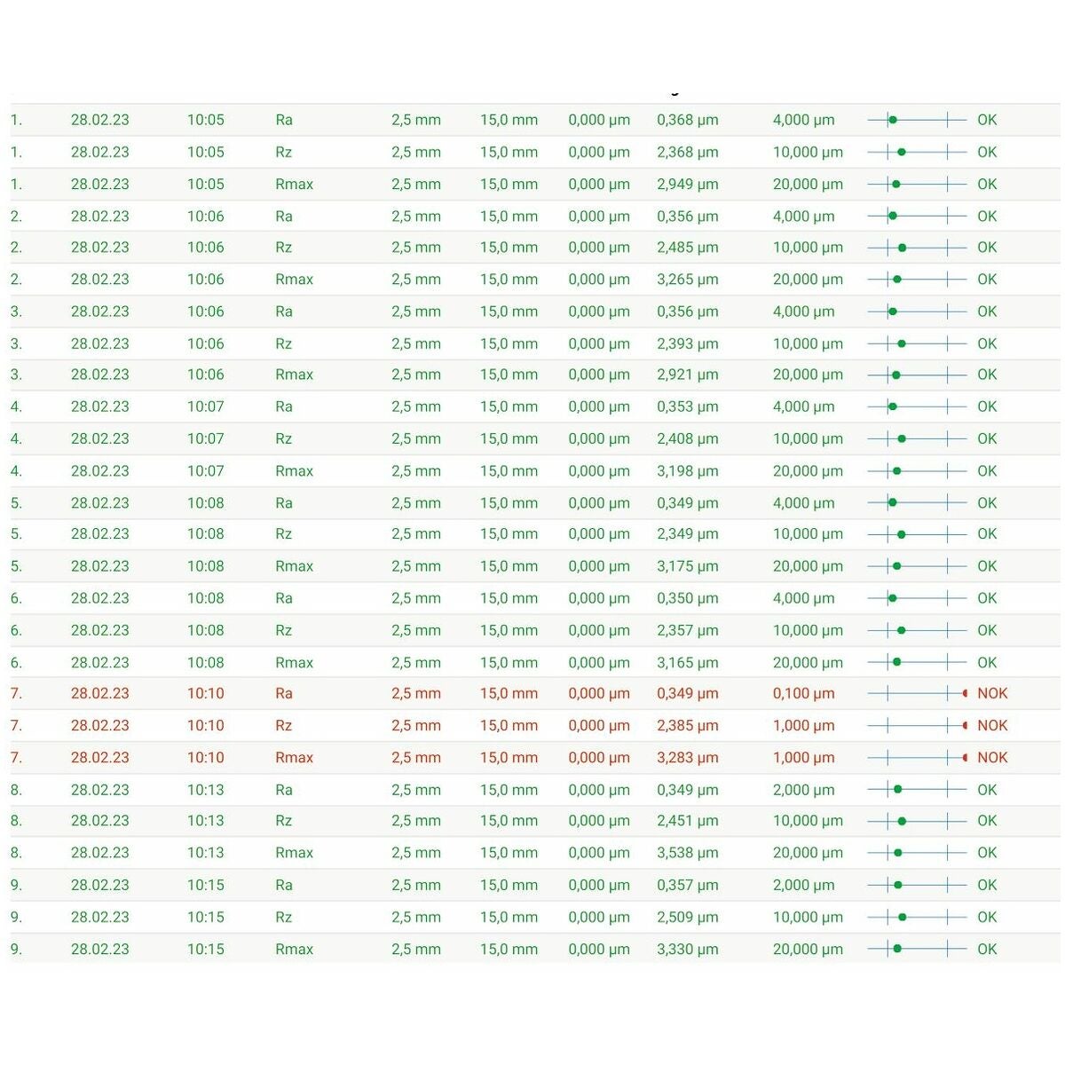 Toleransövervakning: Det går snabbt att avgöra om det uppmätta värdet ligger inom den angivna toleransen genom att färga egenskapsvärdena (grön - inom toleransen och röd - utanför toleransen). Överensstämmer med IATF 16949 – säker spårbarhet.