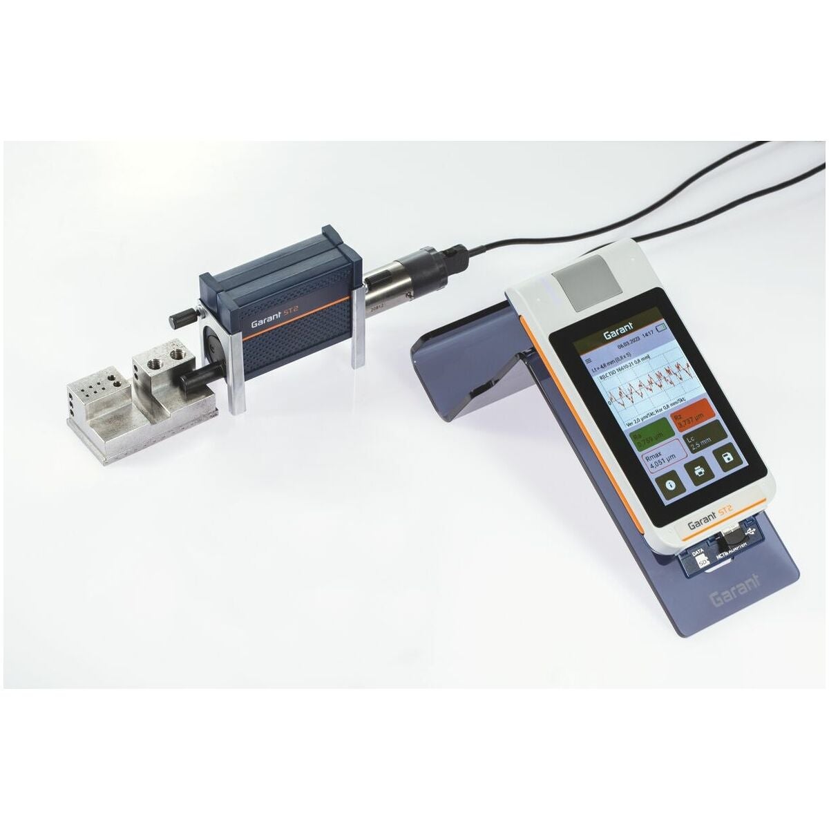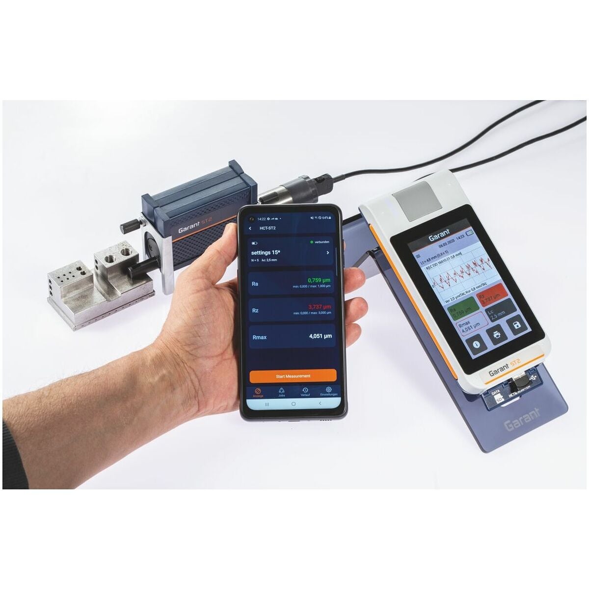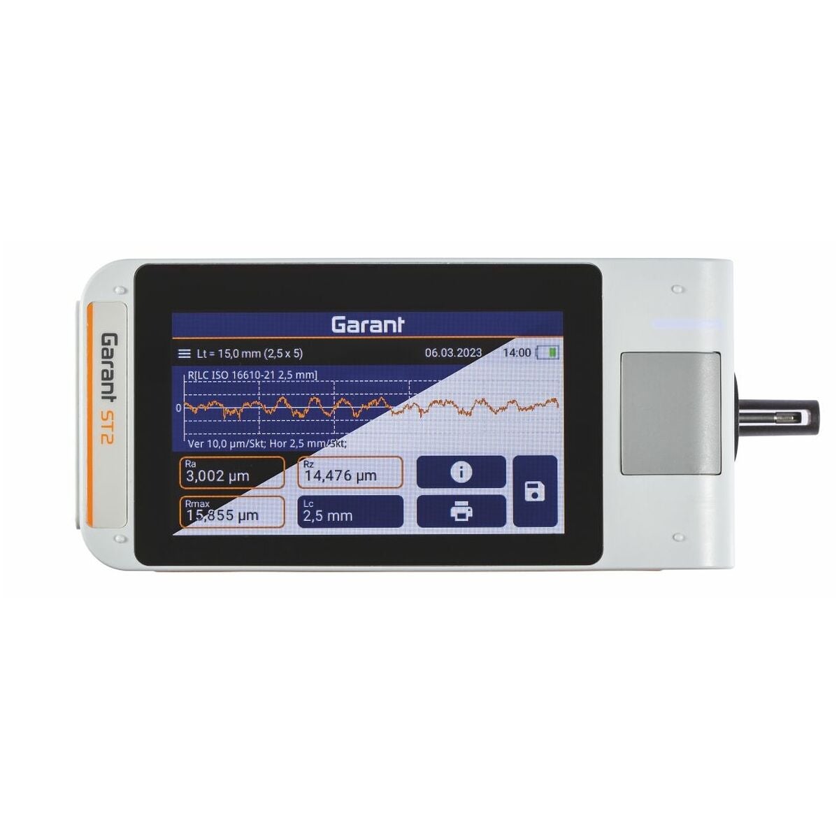 Med inbyggd kalibreringsnormal (kan tas ut). Stor och belyst 4,3″-TFT-pekskärm. Vridbar display. Inbyggd matningsenhet som kan användas separat. LED-ljusramp för tillståndsvisning (grön - batteritillståndsindikering, röd - felmeddelande, blå - mätning, dataöverföring), integrerad höjdjustering, datasäkring som TXT-, X3P-, CSV- och PDF-fil. Gaussfilter enligt ISO 16610 − 21 (ersätter DIN EN ISO 11562), specialfilter enligt DIN EN ISO 13565 − 1, IS-filter enligt DIN EN ISO 3274 (frånkopplingsbart).