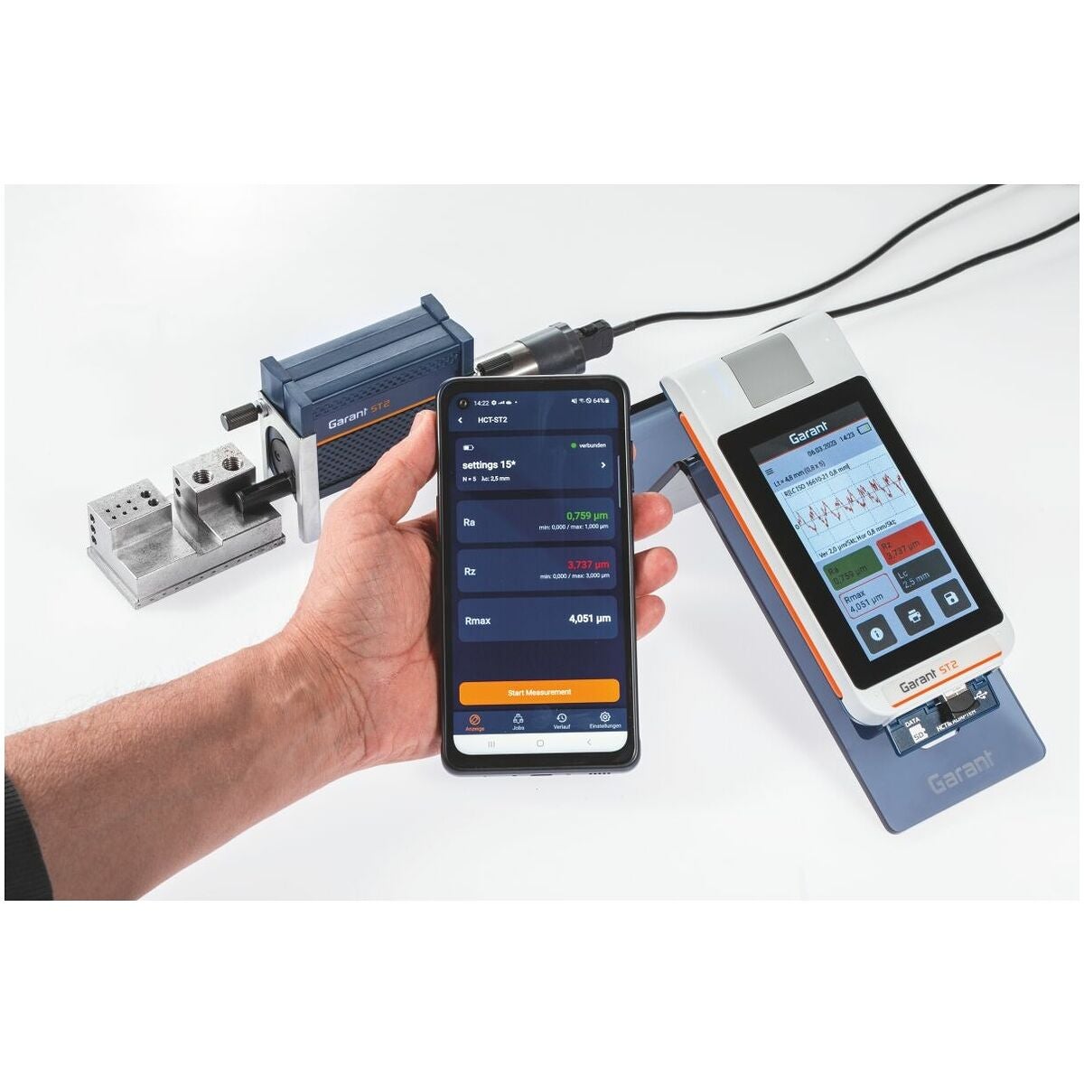 Med inbyggd kalibreringsnormal (kan tas ut). Stor och belyst 4,3″-TFT-pekskärm. Vridbar display. Inbyggd matningsenhet som kan användas separat. LED-ljusramp för tillståndsvisning (grön - batteritillståndsindikering, röd - felmeddelande, blå - mätning, dataöverföring), integrerad höjdjustering, datasäkring som TXT-, X3P-, CSV- och PDF-fil. Gaussfilter enligt ISO 16610 − 21 (ersätter DIN EN ISO 11562), specialfilter enligt DIN EN ISO 13565 − 1, IS-filter enligt DIN EN ISO 3274 (frånkopplingsbart).
